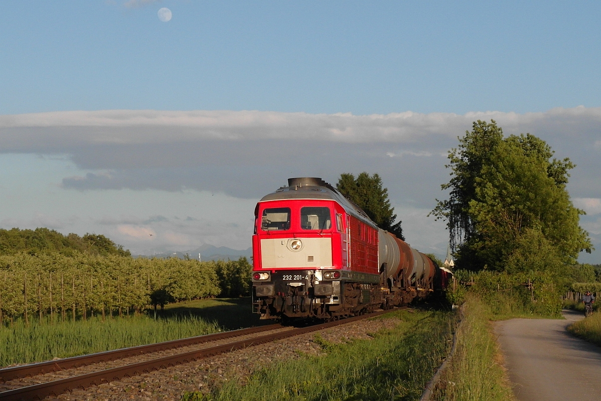 Zwischen Eriskirch und Friedrichshafen zieht 232 201-4 einen in Lindau-Reutin übernommenen gemischten Güterzug Richtung Ulm (07.06.2017).