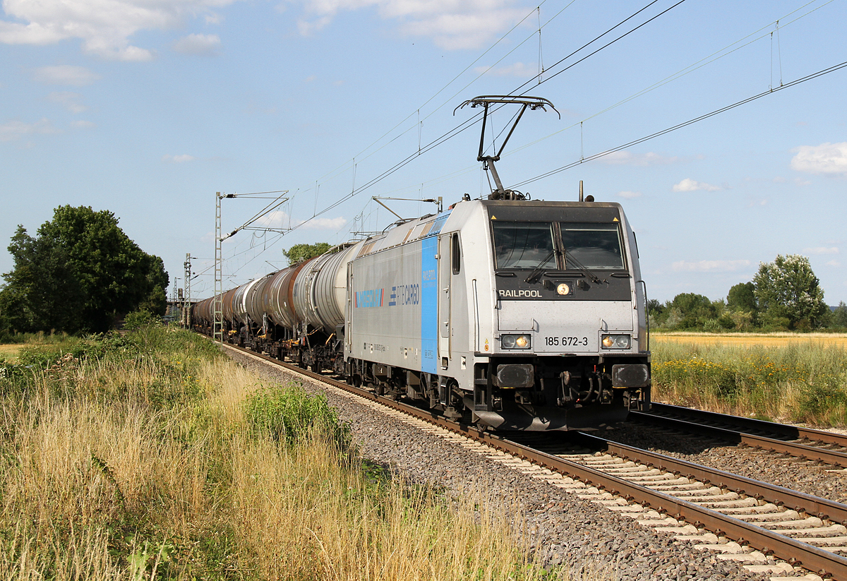 Die an DB Cargo vermietete Railpool 155 191 schleppt die abgebügelte DB 143 055 und einen gemischten Güterzug am 18.07.17 bei Wahnebergen in Richtung Bremen.