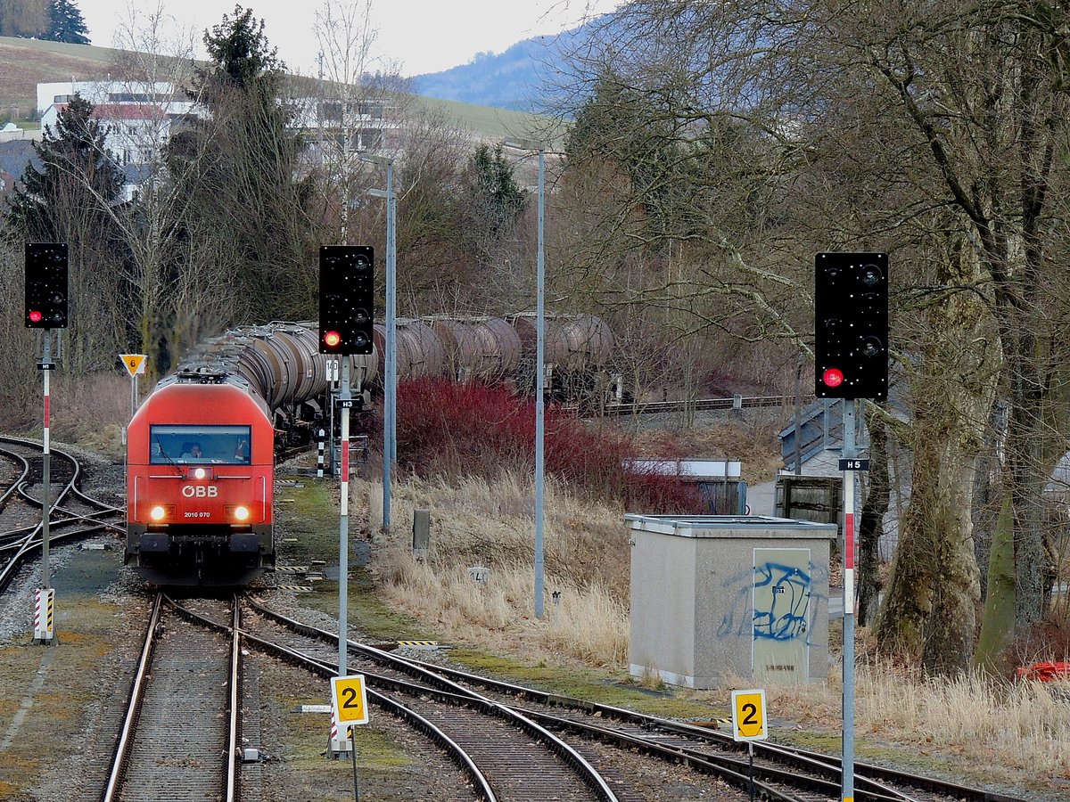 2016 070-2 erreicht mit dem leeren Kesselwagenzug GAG47850 den Bhf. Ried, hier erfolgt nun Tfzf-Wechsel, bevor es weiter nach Simbach/Inn geht; 170224