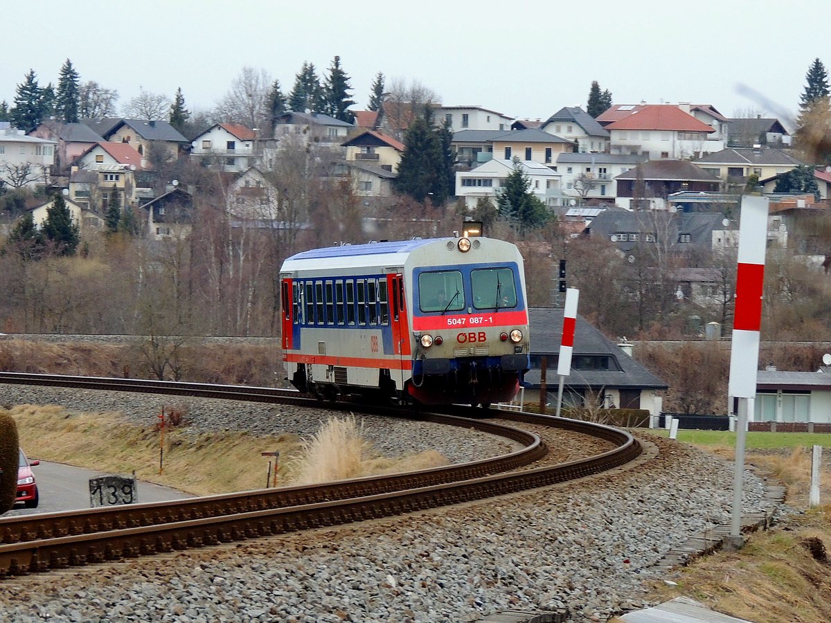5047 087-1 verlässt als R3484 bei Salzkammergutbahnkilometer 139,7 die Bezirkshauptstadt Ried in Richtung Hausruck, bzw. Attnang/Puchheim; 170228