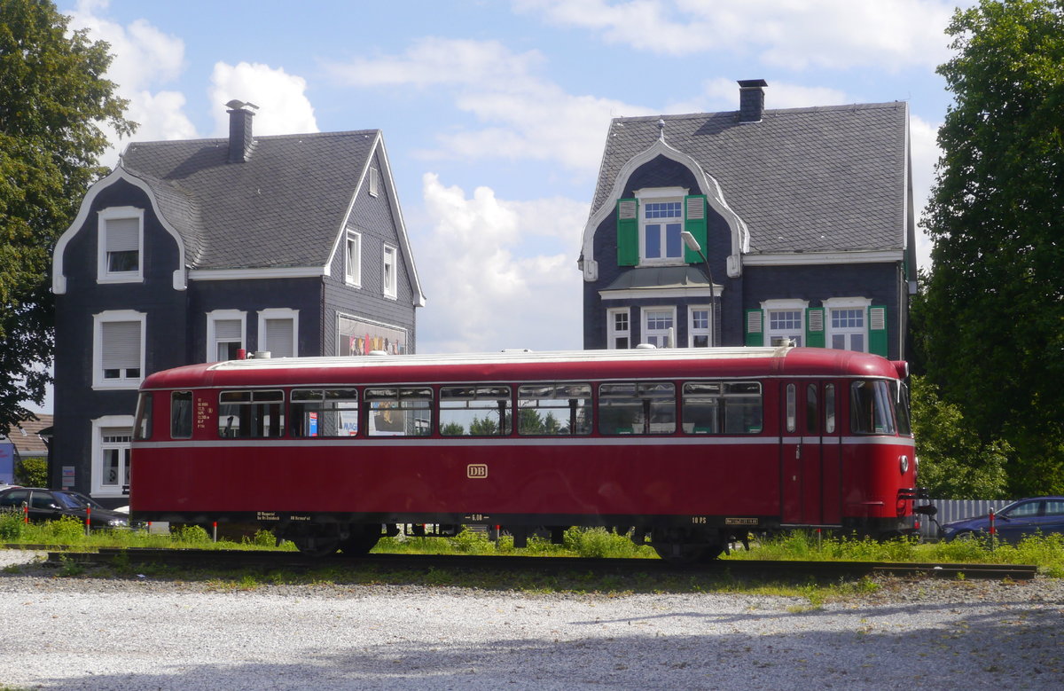 Ein Uerdinger-VT 95 steht als Denkmal der ehemaligen KBS 228g Wuppertal-Steinbeck - Wuppertal-Cronenberg auf dem Parkplatz der Firma Knipex in der Nähe des früheren Endbahnhofs Cronenberg. Aufnahme vom 23.7.17. Das Fahrzeug trägt die Nr. Vt 95 9164, war aber ursprünglich bei der DB als 9144 eingereiht. Nach seiner Ausmusterung diente es fast 20 Jahre als Indusi-Messwagen 724 003-9. Aus dieser Zeit stammt die Verblendung der jeweils in Fahrtrichtung vorn links befindlichen Tür. Bei der Hochwaldbahn wurde er 2008/9 in den Ursprungszustand zurückversetzt (bis auf die Türen) und mit der Nummer 9164 versehen, weil dieser in seiner aktiven Zeit tatsächlich in Wuppertal-Steinbeck beheimatet war (Danke, Horst!).