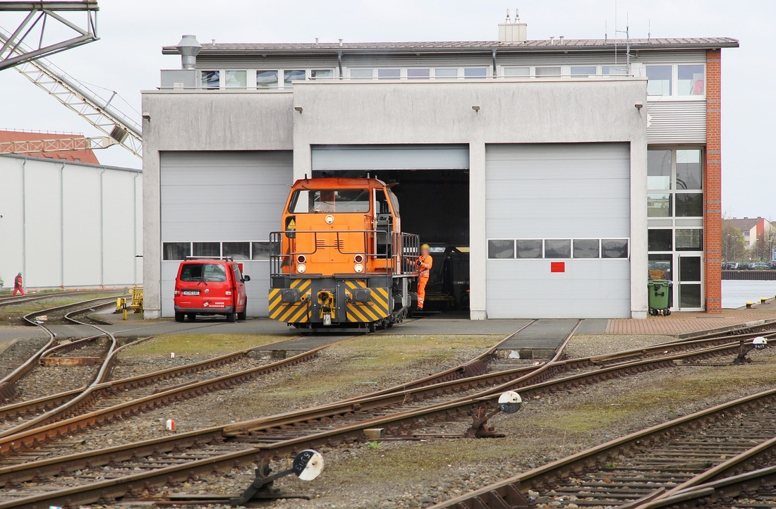 Lok F 8 der Städtischen Häfen Hannover hat zum Aufnahmezeitpunkt den Lokschuppen verlassen.