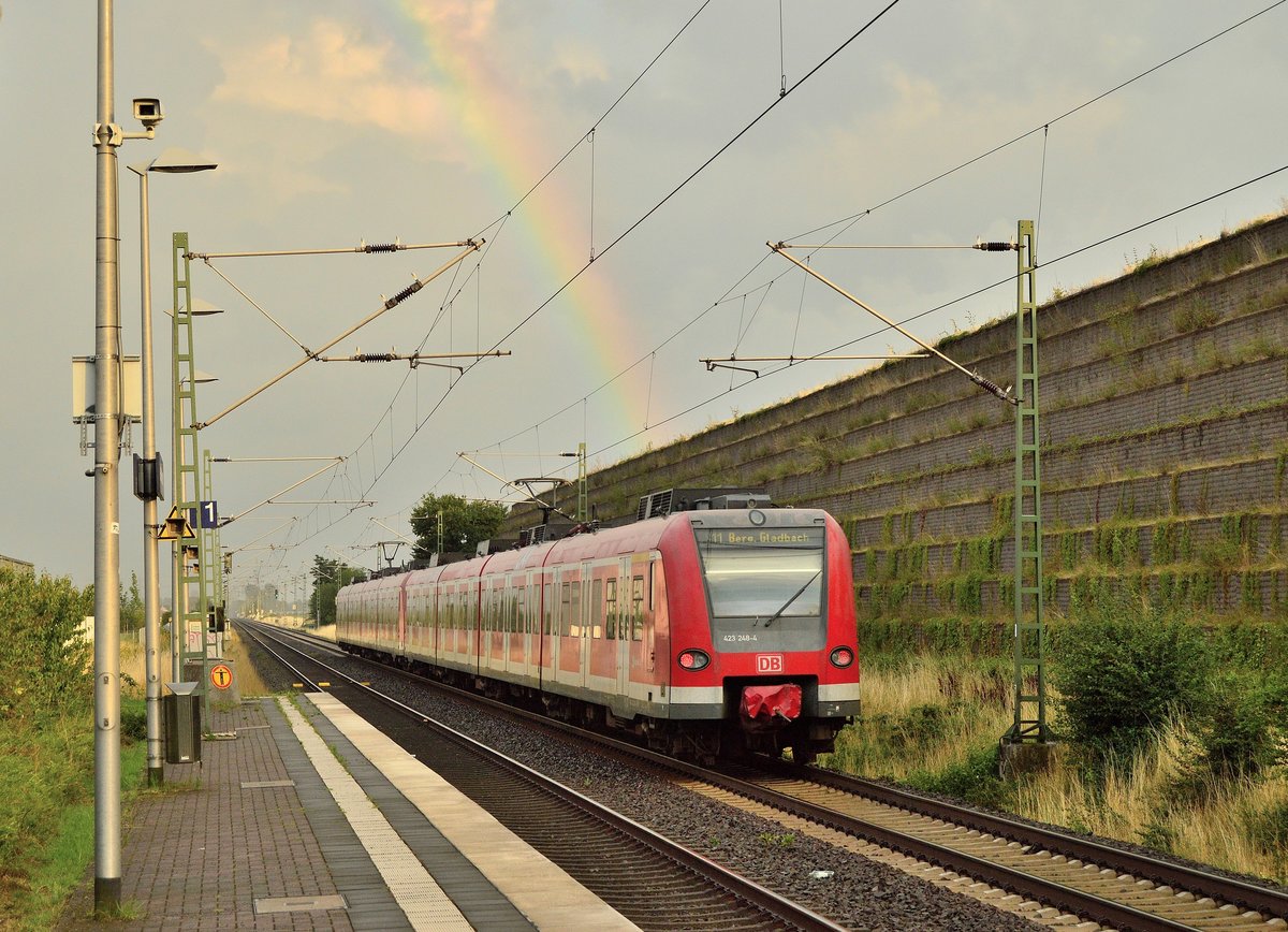 S11 nach Bergisch Gladbach verlässt am heutigen Abend den Bahnhof Allerheiligen, das Wetter spielte mal wieder eine Kapriole. In Richtung Köln regnete es, während von Neuss aus die Sonne schien am Abendhimmel.
