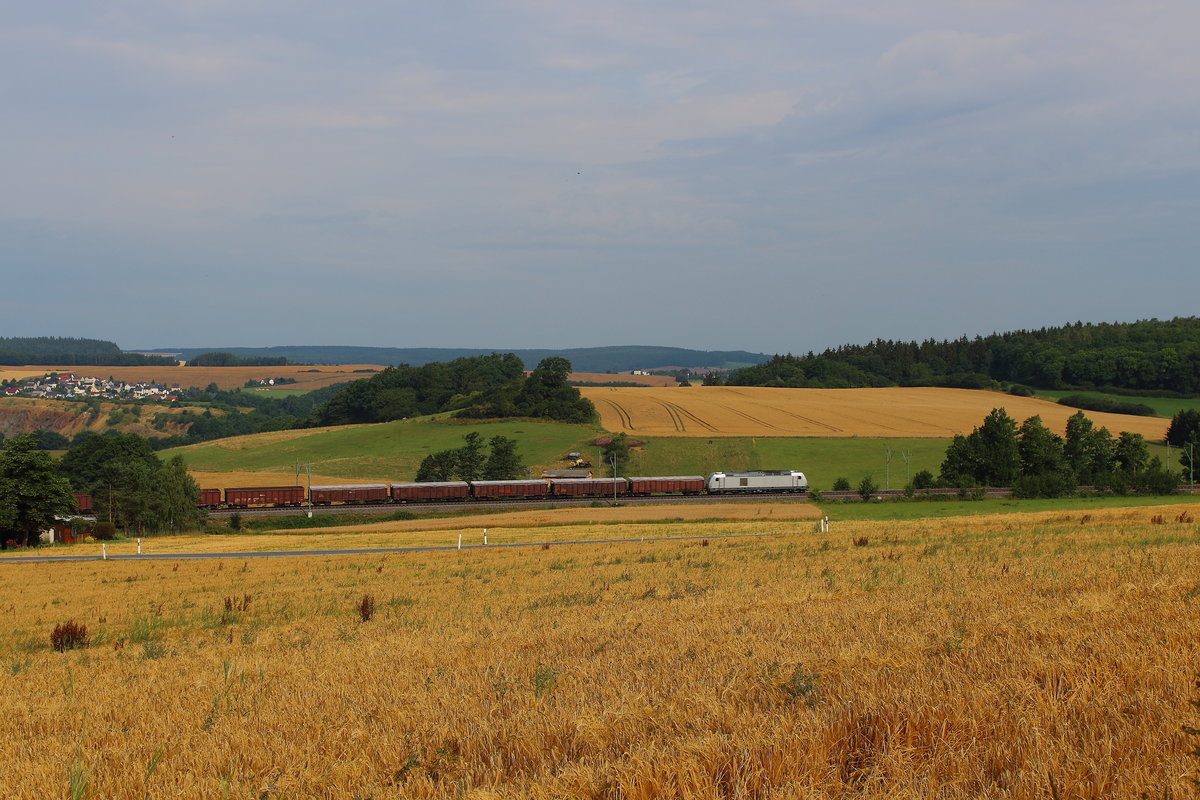 BRLL 266 026, vermietet an FDE, Lok 513-2,  befindet sich mit einem FPL-Hochbordwagenzug am 18.07.17 bei Wahnebergen auf der Fahrt in Richtung Hannover.