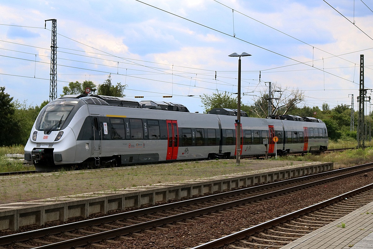 Nachschuss auf 1442 304 (Bombardier Talent 2) von DB Regio Südost als RE 16106 (RE13) von Leipzig Hbf nach Magdeburg Hbf, der den Bahnhof Biederitz verlässt. [14.7.2017 - 12:48 Uhr]