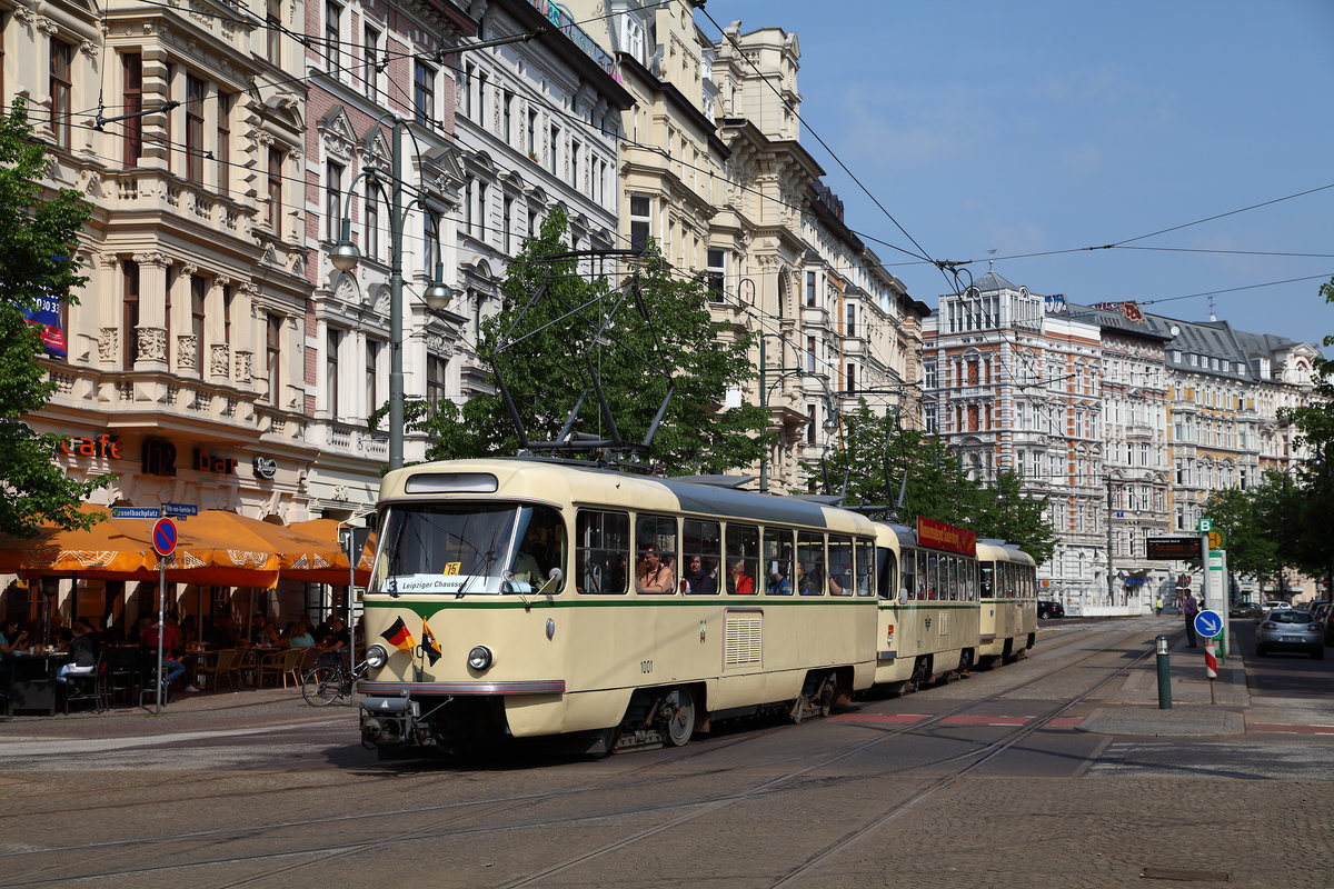 Schöne Museumsfahrzeuge in Magdeburg: der T4-Großzug. Am 27.04.2014 kam er anlässlich des Streckenjubiläums nach Olvenstedt zum Einsatz und passiert soeben den Hasselbachplatz.
