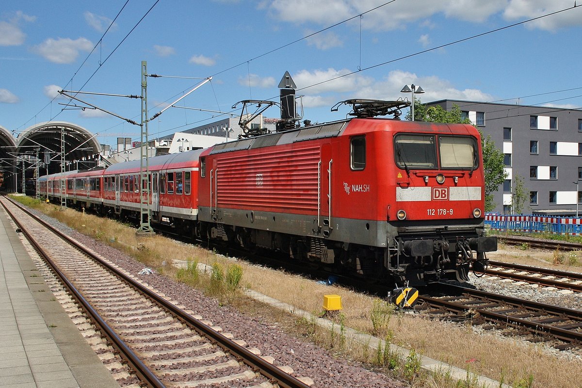 112 178-9 verlässt am 17.6.2017 mit der RB77 (RB21125) nach Neumünster den Kieler Hauptbahnhof.