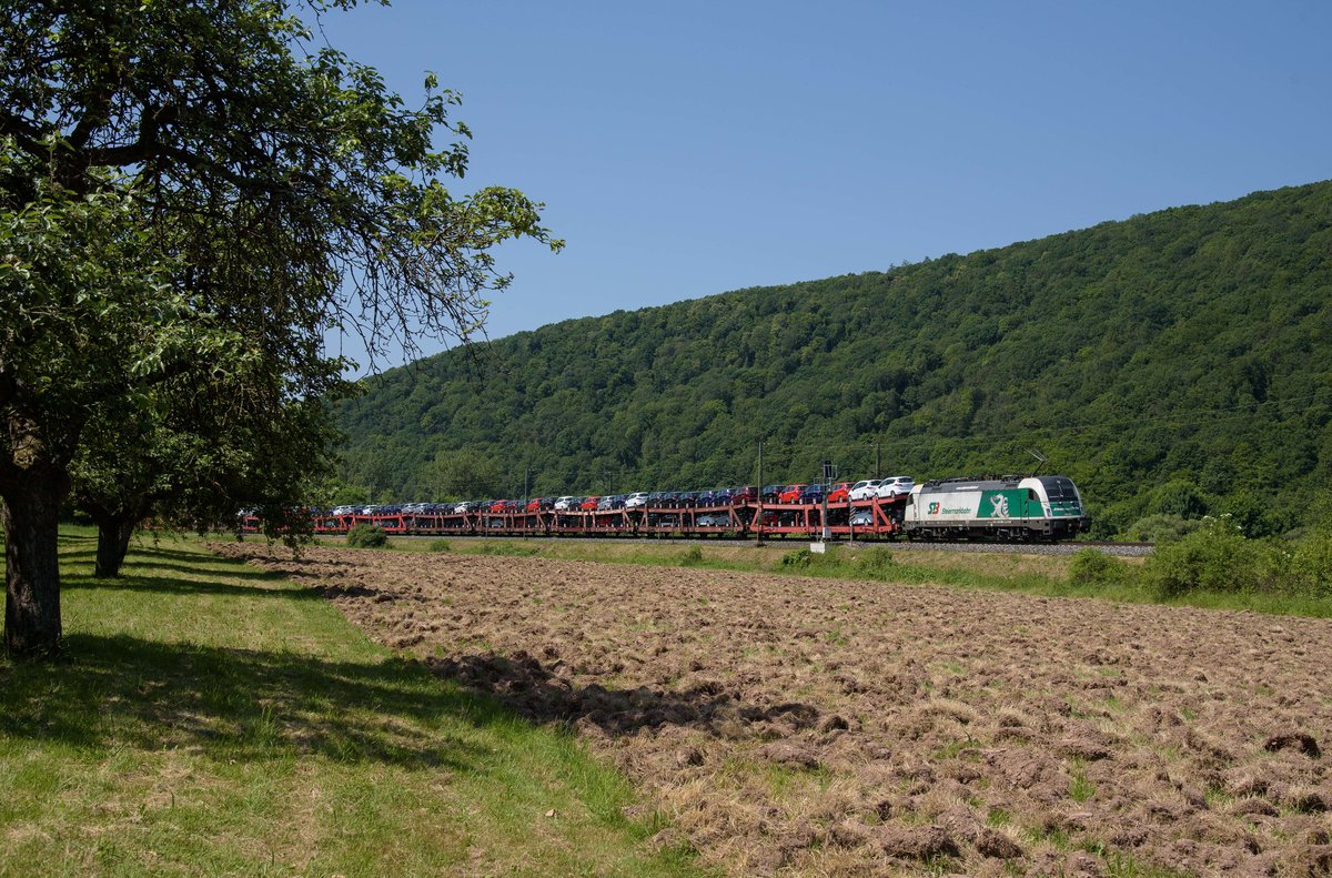 Dringend eine Wäsche verdient hat 186 314-1 von ECR, besonders wenn er einen Autozug der Premiummarke Mercedes durch die Lande zieht. Aufgenommen am 30/06/2017 in s'Herenelderen bei Tongeren.