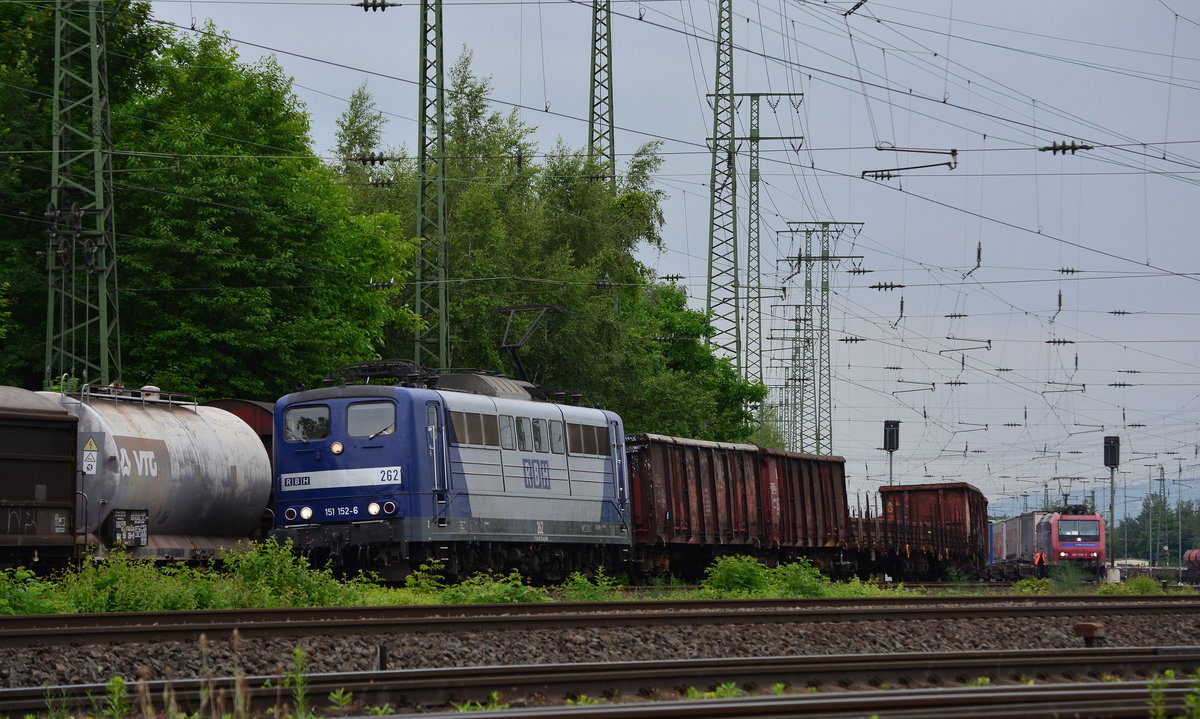 151 152 fährt mit einem Mischer durch Koblenz Lützel gen Koblenz Hbf während der Tf der 482 026-2 eine kurze Pause einlegte.