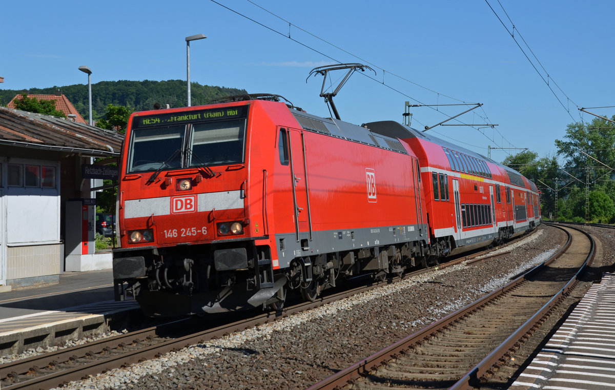 Am 11.06.17 erreicht 146 245 mit einem RE nach Frankfurt(M) den Bahnhof Retzbach-Zellingen.