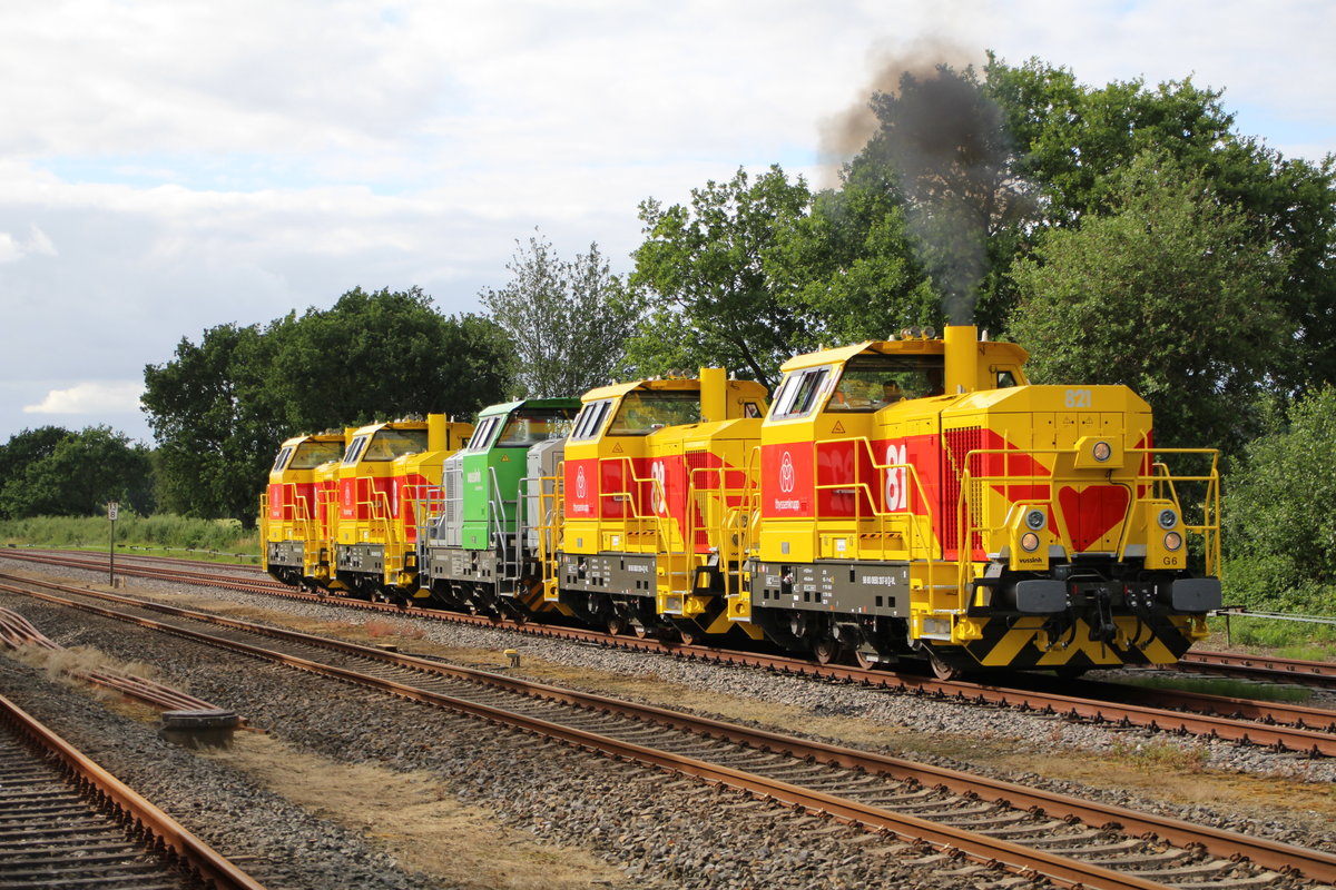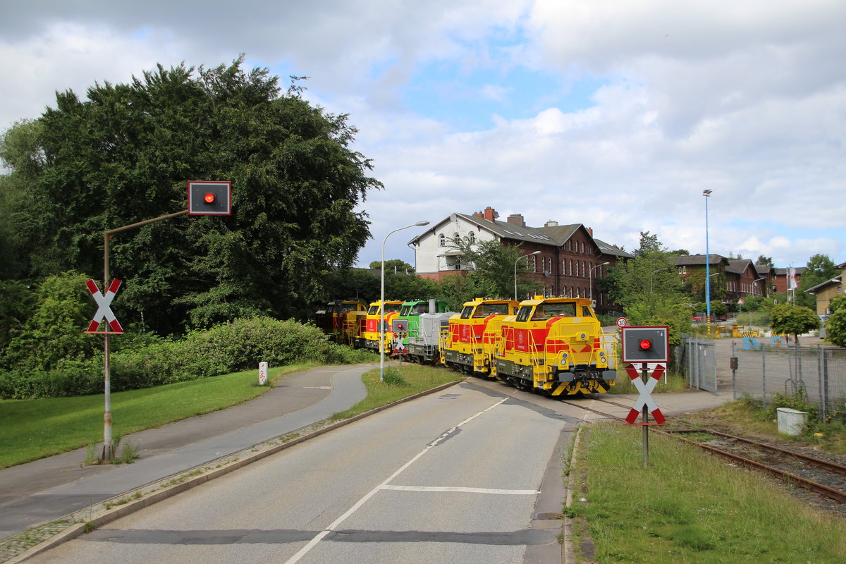 Am 2.7.2017 wurden 4 neue Thyssenkrupp Vossloh G6 vom Vossloh Werk in Kiel Friedrichsort nach Hamburg-Harburg überführt.
