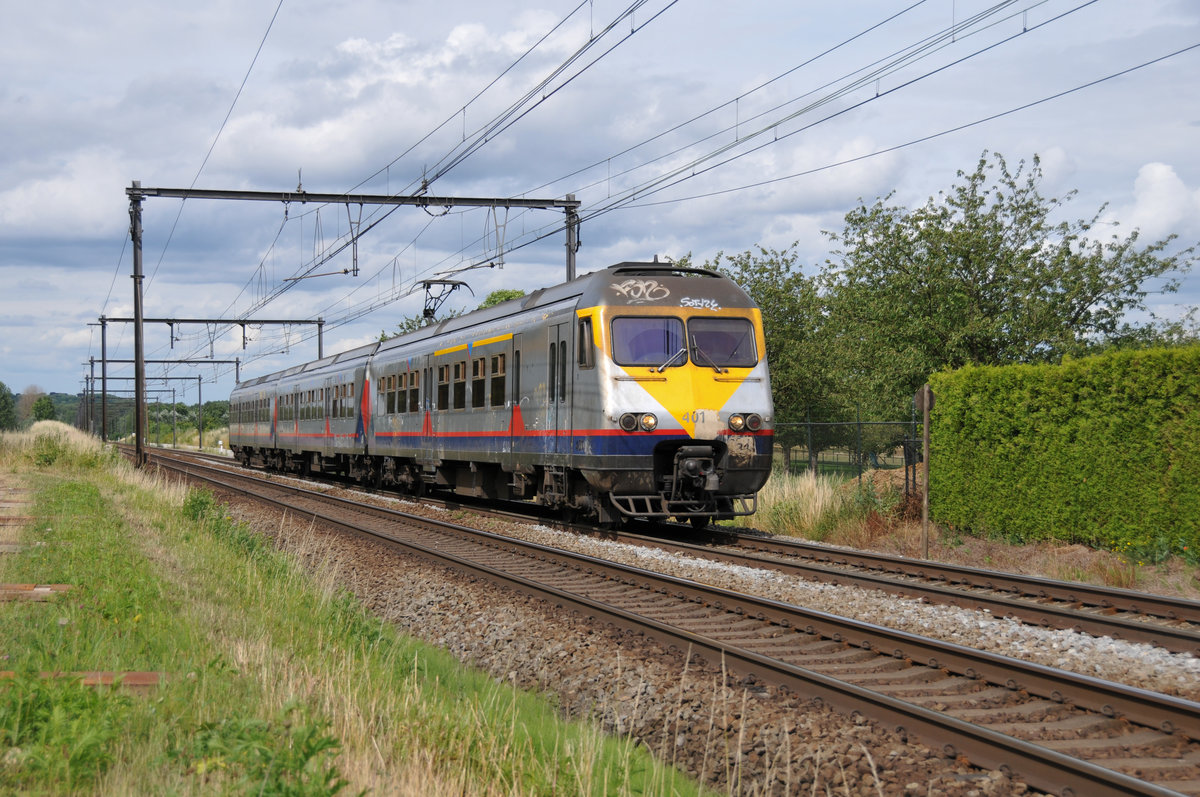 Arg mitgenommen sieht Triebzug 401 der Serie AM80 aus. Das Entfernen der zahlreichen Graffitis hat seine Spuren hinterlassen. Fotografiert am 30/06/2017 in s'Herenelderen.
