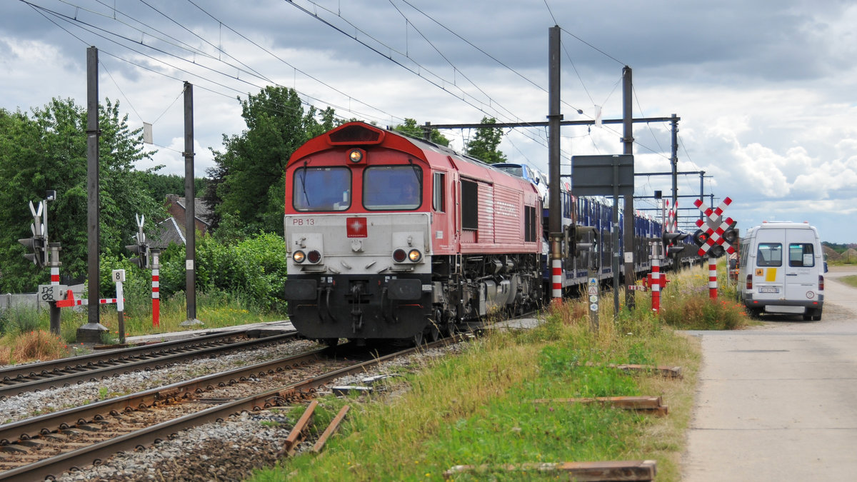 Die Class66 PB13 von Crossrail zieht einen Autozug in Richtung in Richtung Hasselt. Aufgenommen am 30/06/2017 in s'Herenelderen.