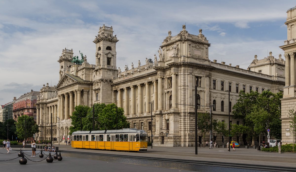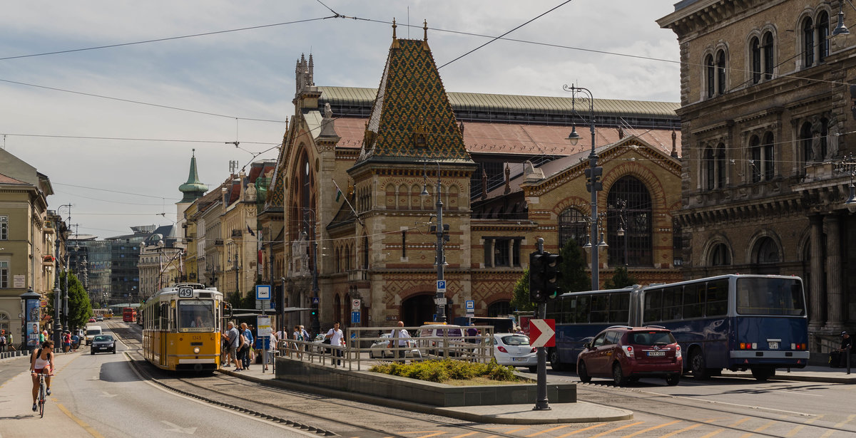 Tw 1349 beim Fahrgastwechsel vor der altehrwürdigen Markthalle "Nagy Vásárcsarnok"
