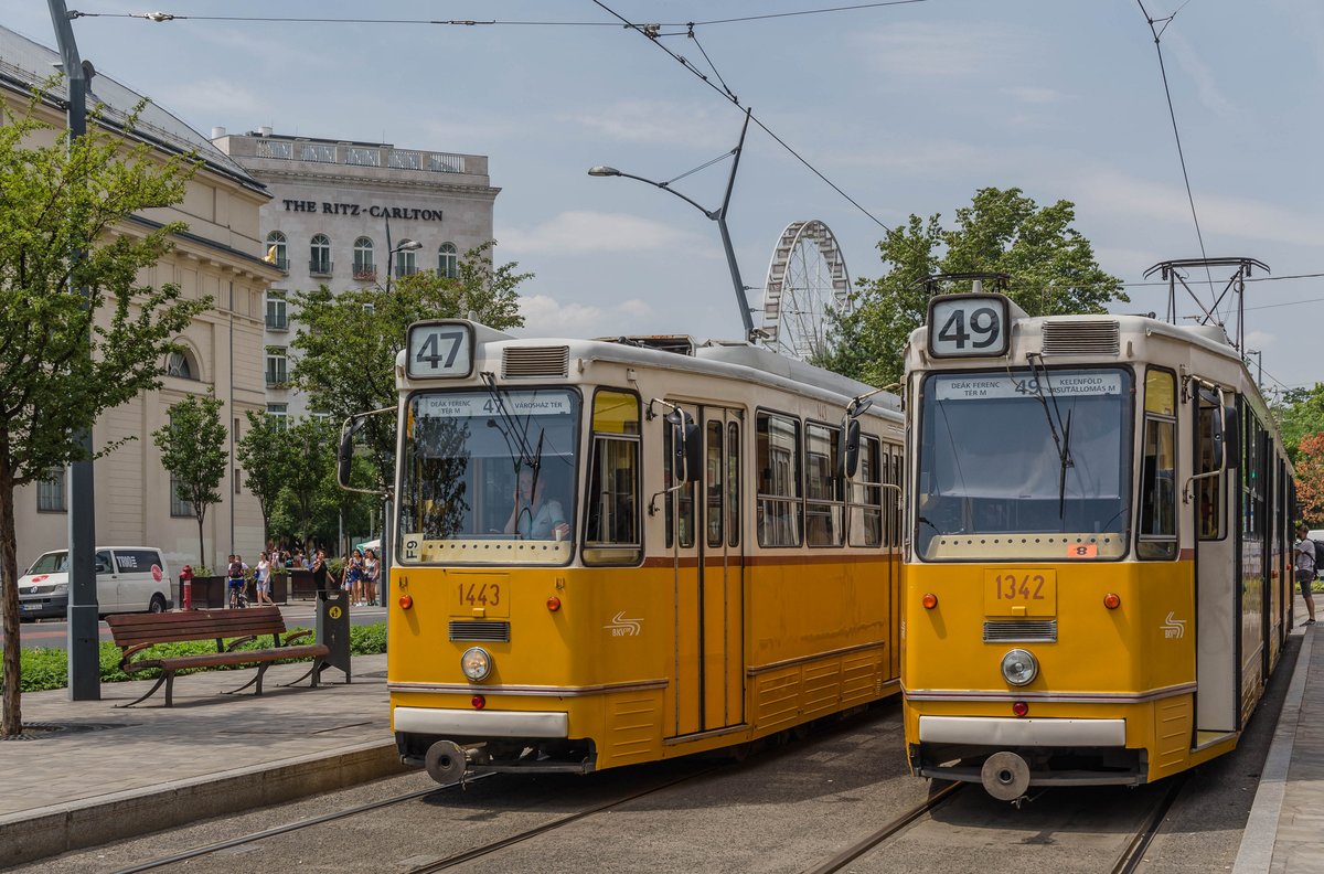 Ganz Tw 1443 neben Tw 1342 am 29.Juni.2017 in der Endstelle "Deák Ferenc tér M"