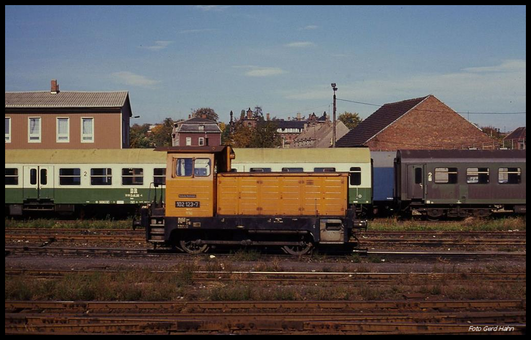Rangierlok 102123 am 3.10.1990 im Bahnhof Gotha.