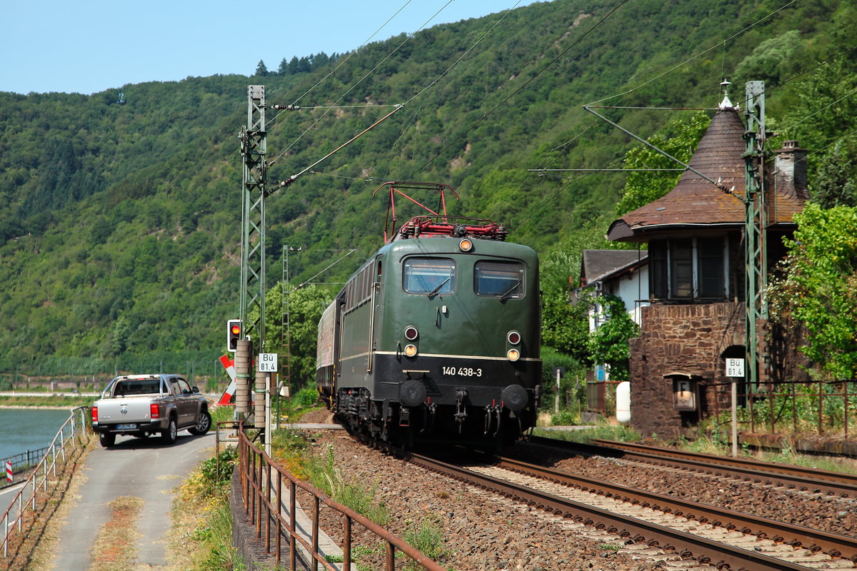 140 438 der Bayern-Bahn ist eine der Stammloks für den so genannten "Henkel-Zug" von Langenfeld nach Wassertrüdigen. Am 11.07.2015 war die im klassischen grün der Bundesbahn gehaltene Maschine bei Kaub an der Landesgrenze Rheinland-Pfalz und Hessen zu sehen.