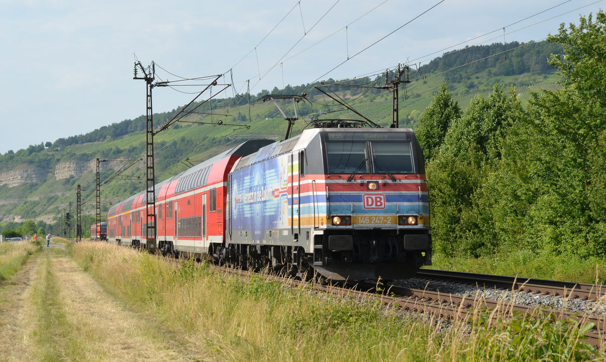 146 247 führ mit einem RE nach Bamberg am 15.06.17 durch Thüngersheim Richtung Würzburg.