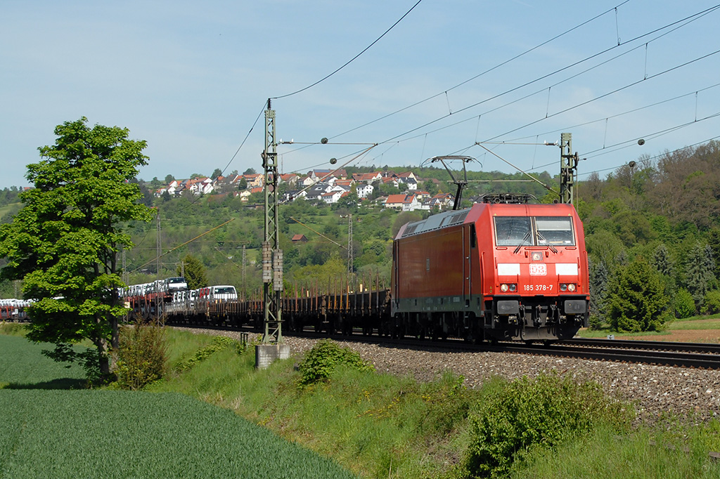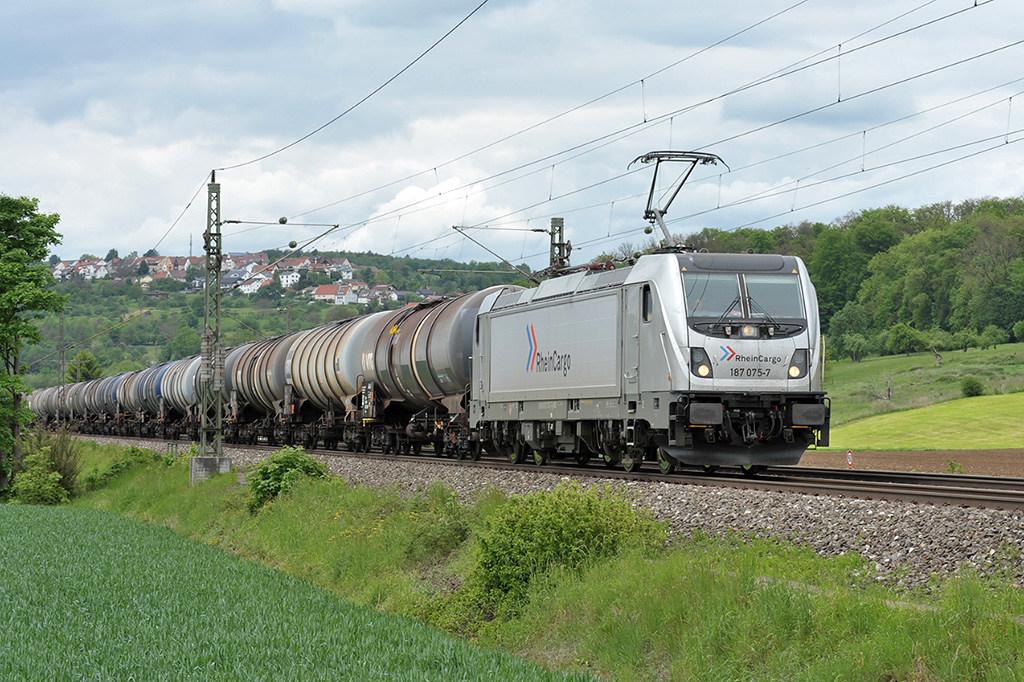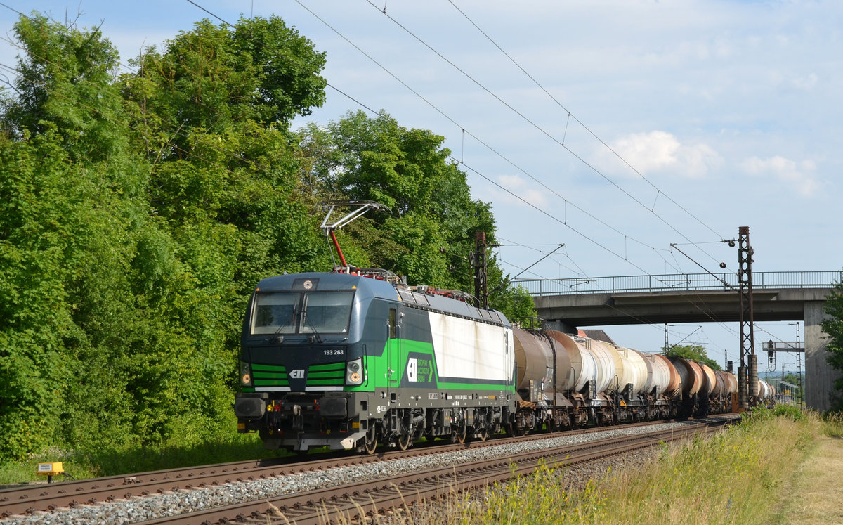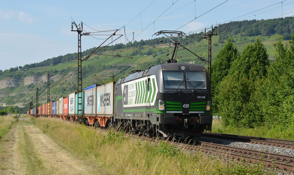 Mit ihrer firmeninternen Eigenwerbung rollte 193 208 am 15.06.17 durch Thüngersheim. Sie war mit einem Containerzug in Richtung Würzburg unterwegs.