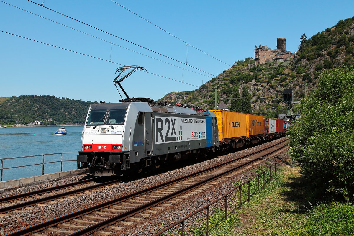 Einen schönen Blick auf den Loreleyfelsen und den Rhein ergibt sich bei Sankt Goarshausen-Patersberg. Am 27.05.2017 war eine unbekannte 185 mit einem nordwärts fahrenden Containerzug unterwegs.