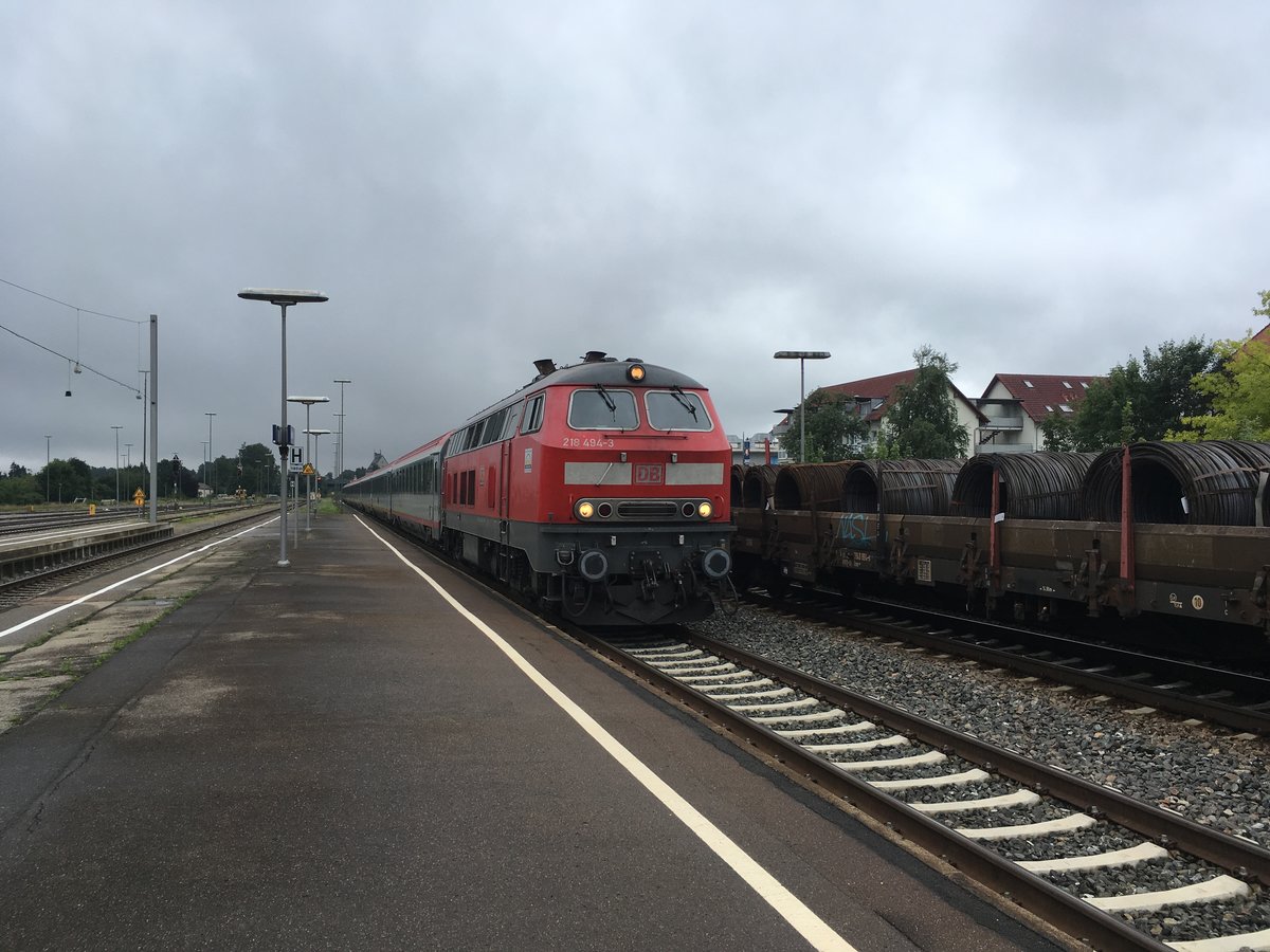 218 494 am 27.07.17 Solo vor IC 118 nach Münster, bei der Einfahrt in Aulendorf.