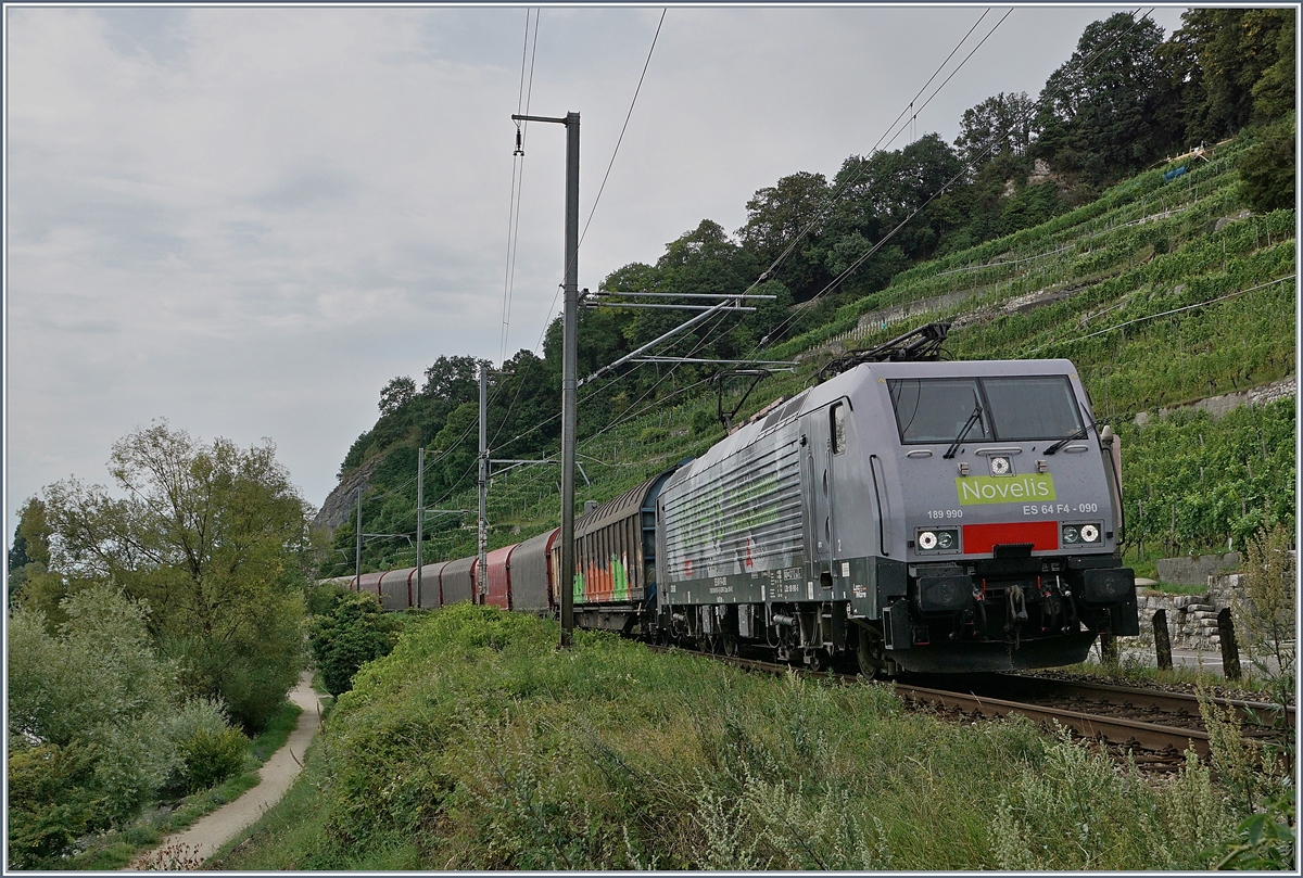 Die MRCE 189 090 "Göttingen" (UIC 91 80 6189 990-5 D-Dispo Class 189-VE), vermietet an SBB Cargo, in der Novelis-Farbgebung mit ihrem Aluminiumzug Sierre - Göttingen kurz vor Twann, dem wohl einzigen Einspurstreckenabschnitt auf ihrer langen Fahrt. 31. Juli 2017