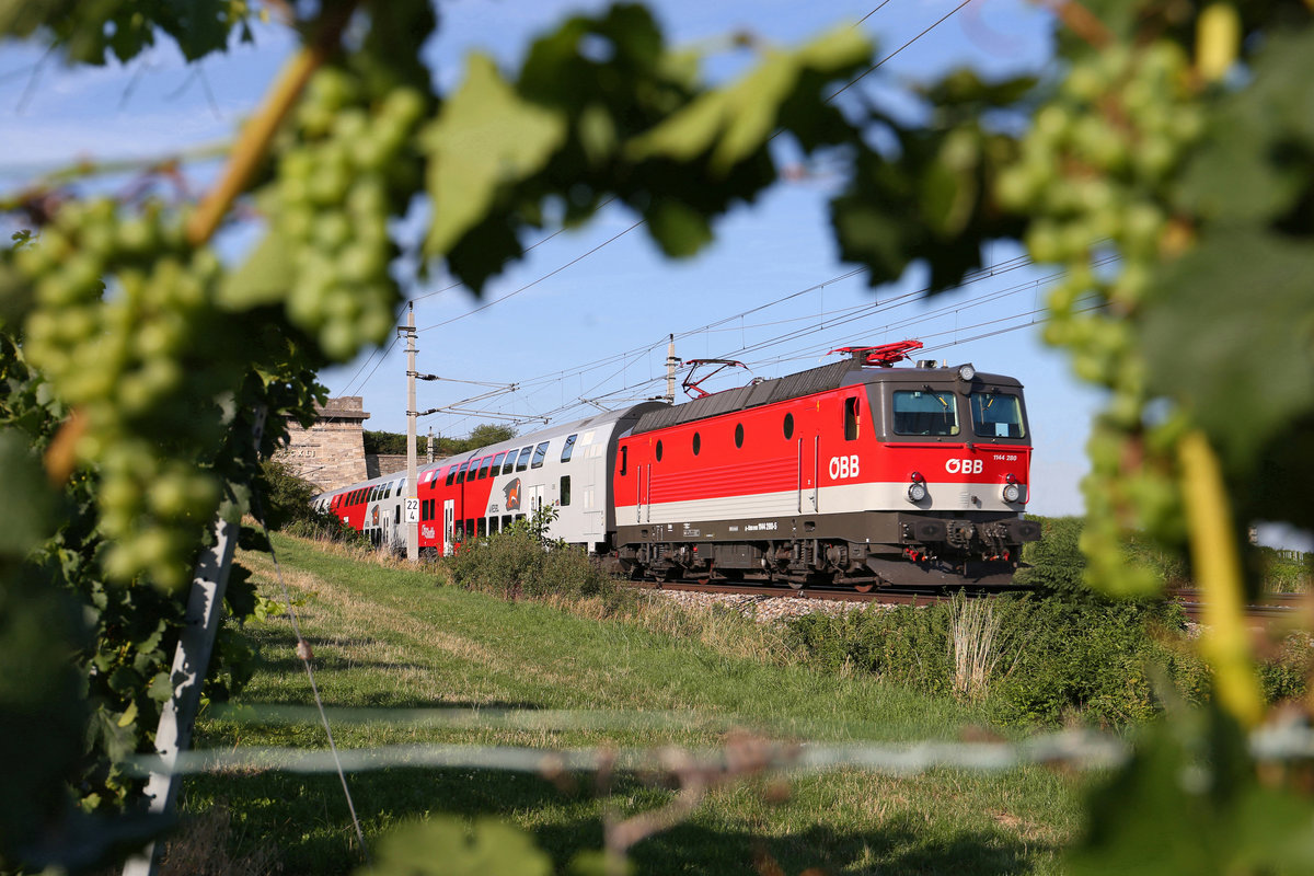 Die Nagelneue am 6.6.17 aus der HW ausgetretene 1144.280 hat mit R-2253 den "Busserltunnel" in den Weinbergen zwischen Gumpoldskirchen und Pfaffstätten verlassen. 31.7.17