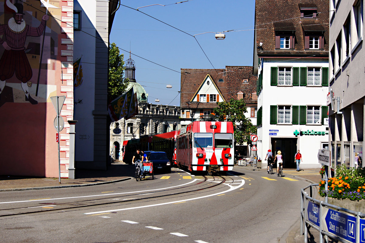 FW/AB: Für die Frauenfeld Wil Bahn war der 22. August 2010 ein Großkampftag der den Einsatz vom gesamten zur Verfügung gestandenen Rollmaterial erforderte. Bereits am frühen Morgen quälte sich ein Dreiwagenzug als Straßenbahn durch die Altstadt von Frauenfeld. Foto: Walter Ruetsch