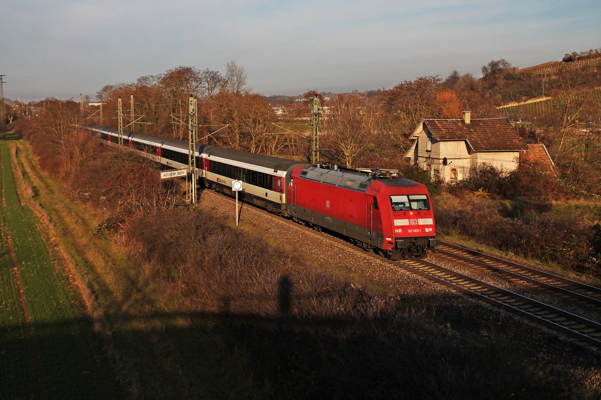 Mit dem EC 9 (Hamburg Altona - Zürich HB) fuhr am Nachmittag des 05.12.2015 die 101 065-1 kurz hinter Müllheim (baden) in Richtung Schweizer Grenze.
