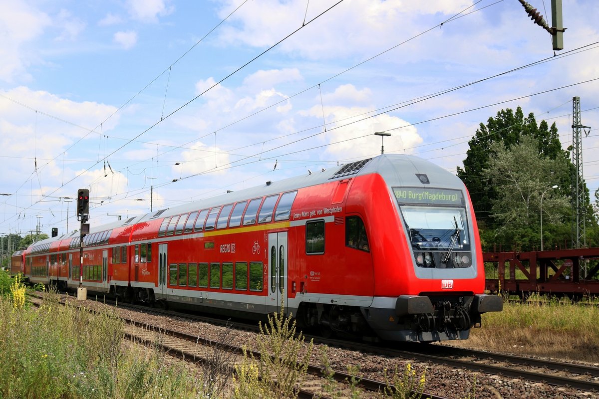 Nachschuss auf DABpbzfa "Jenny Marx geb. von Westphalen" mit BR 146.0 als Zuglok als RB 16425 (RB40) von Braunschweig Hbf nach Burg(Magdeburg), der den Bahnhof Helmstedt verlässt. [14.7.2017 - 14:49 Uhr]