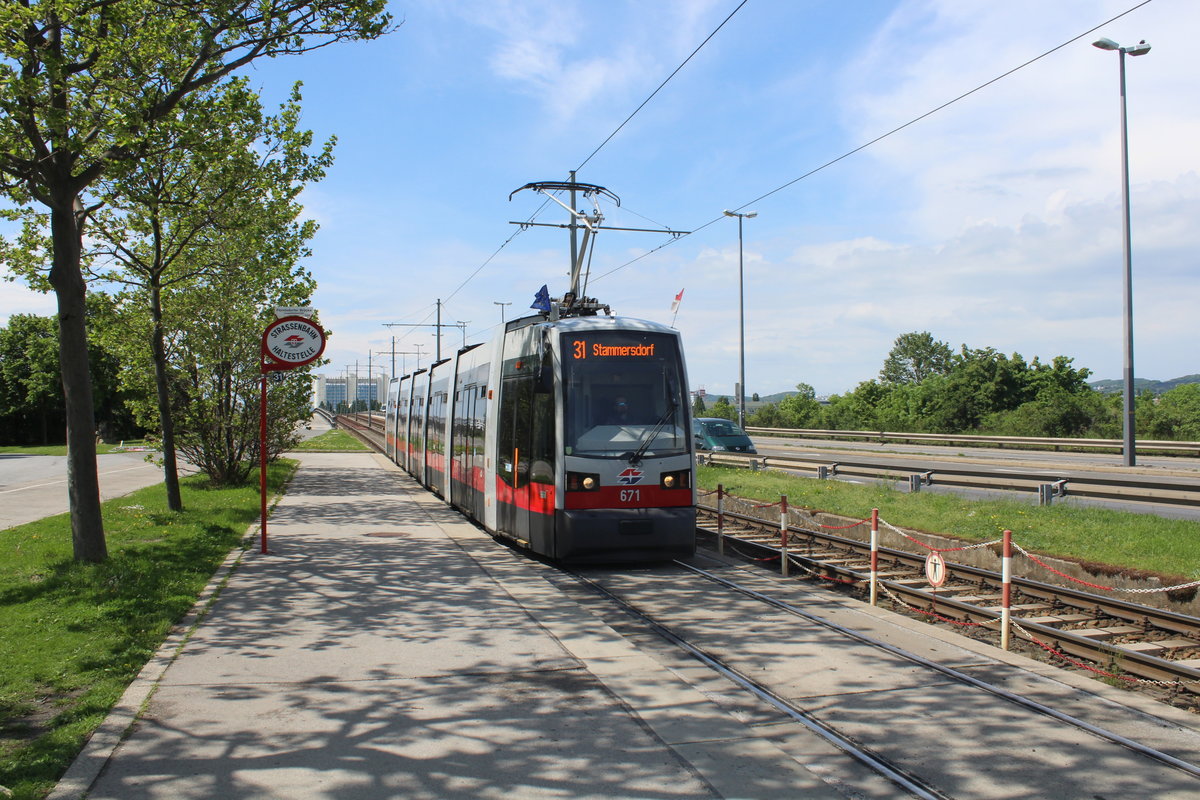 Wien Wiener Linien SL 31: Der ULF B 671 erreicht am Vormittag des 13. Mai 2017 die Haltestelle Floridsdorfer Brücke auf der Donauinsel.