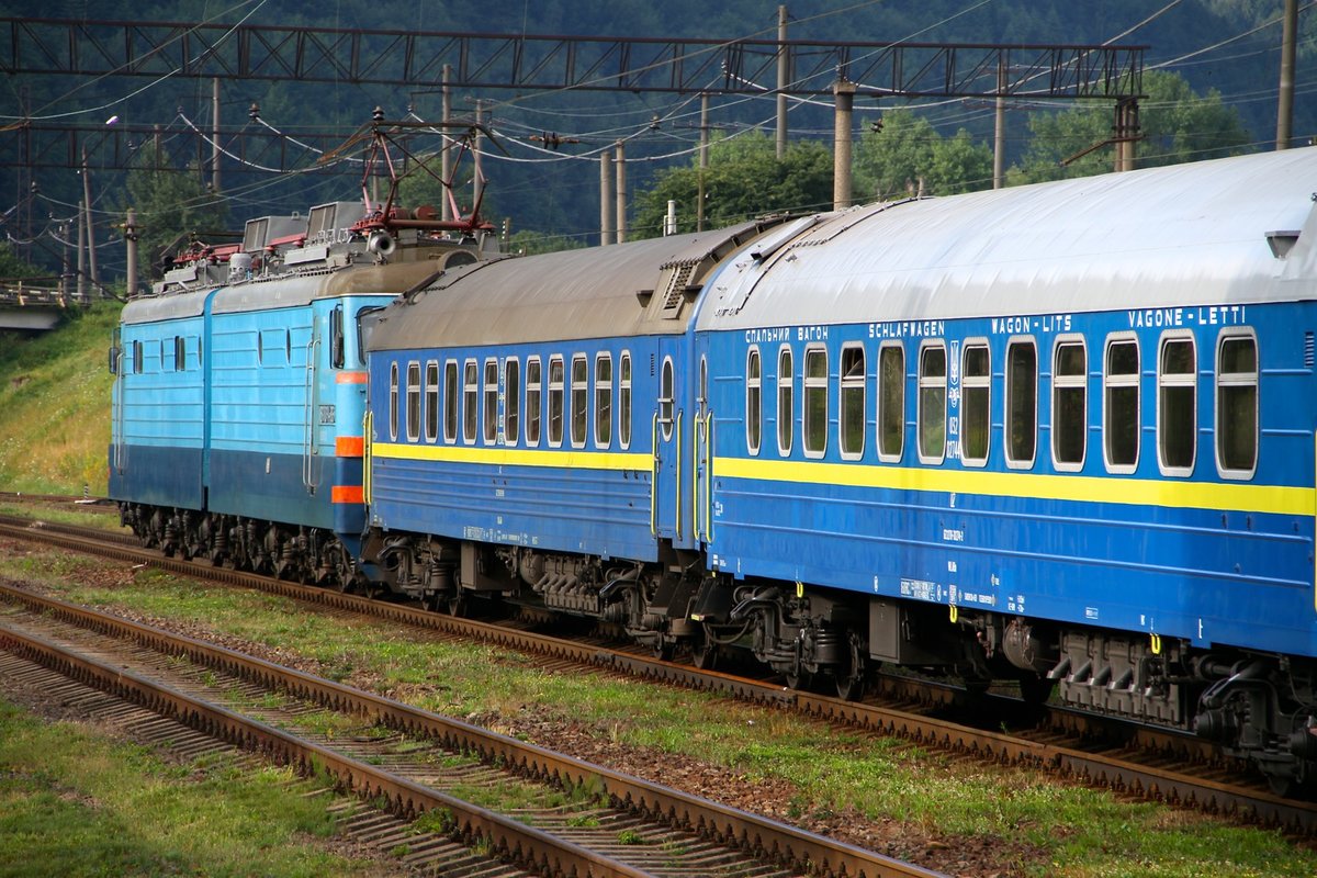 WL10-1486 in Skole, ein kleines Städtchen in den Karpaten. Das ist der Zug Lviv Uzghorod am Morgen des 22.07.2017. Schlafwagen auf vielen verschieden Sprachen geschrieben.