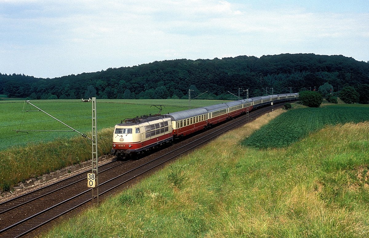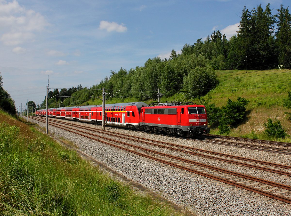 Die 111 055 mit einem RE nach München am 10.06.2016 unterwegs bei Unterweilbach.