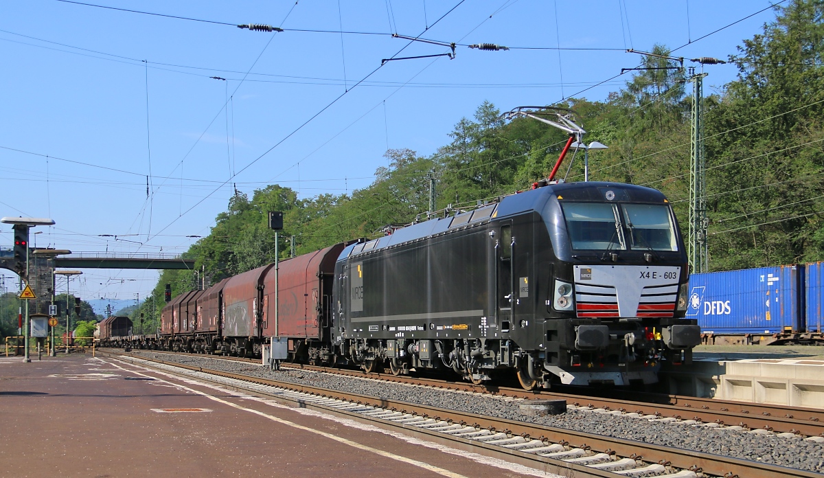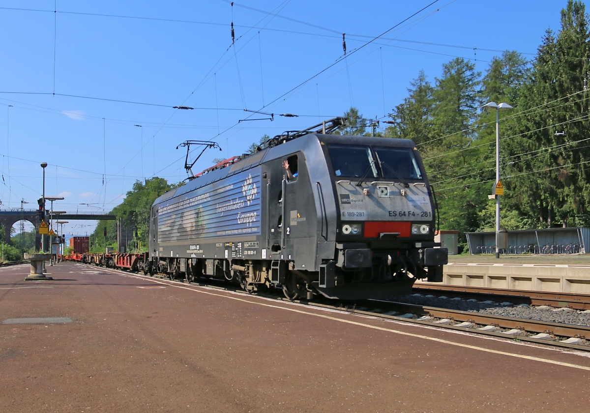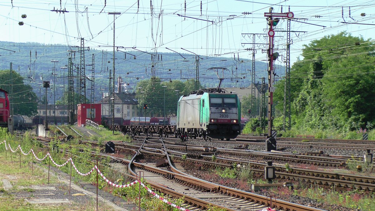 Die SNCB 186 230 (2838) fährt am Morgen des 11.06.2017 in Koblenz-Lützel mit einem leeren Containerzug durch.