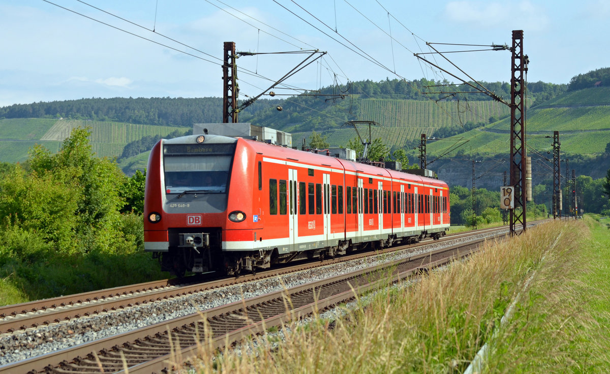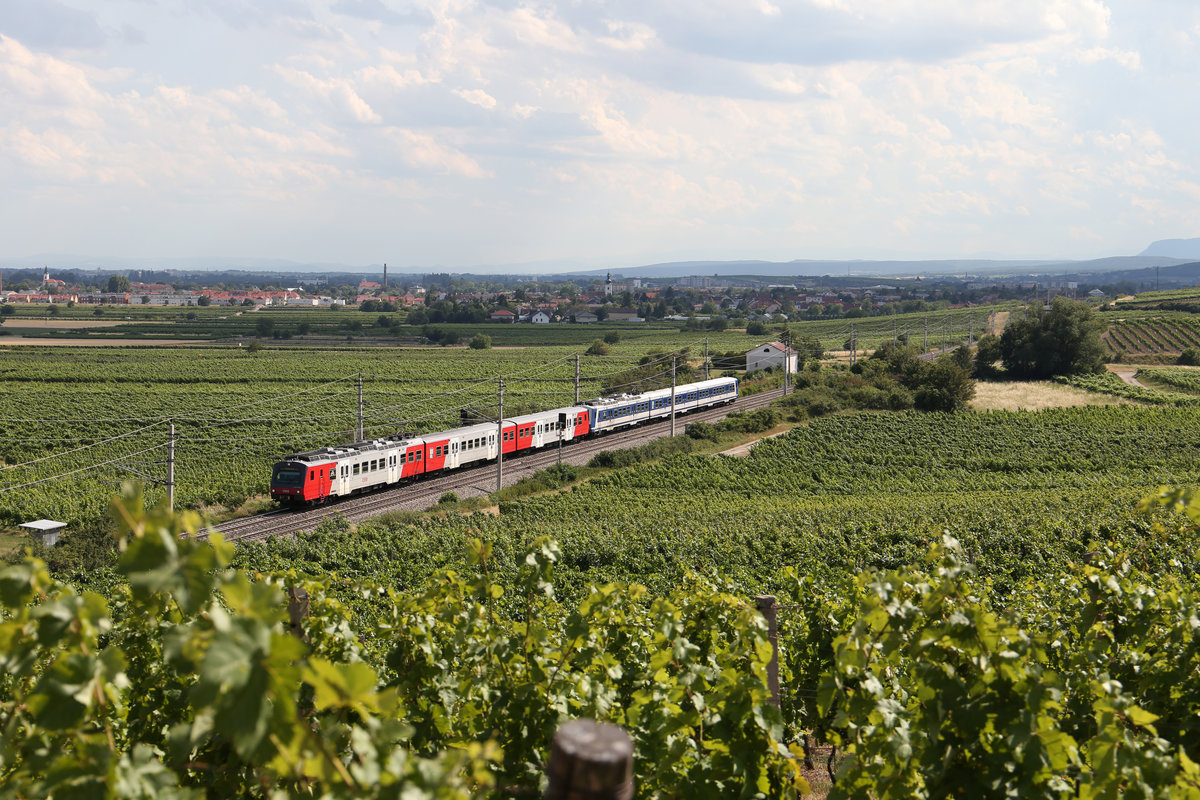 Ein farblich gemischtes 4020 Tandem fährt als S durch die Weinberge bei Pfaffstätten. 5.7.17