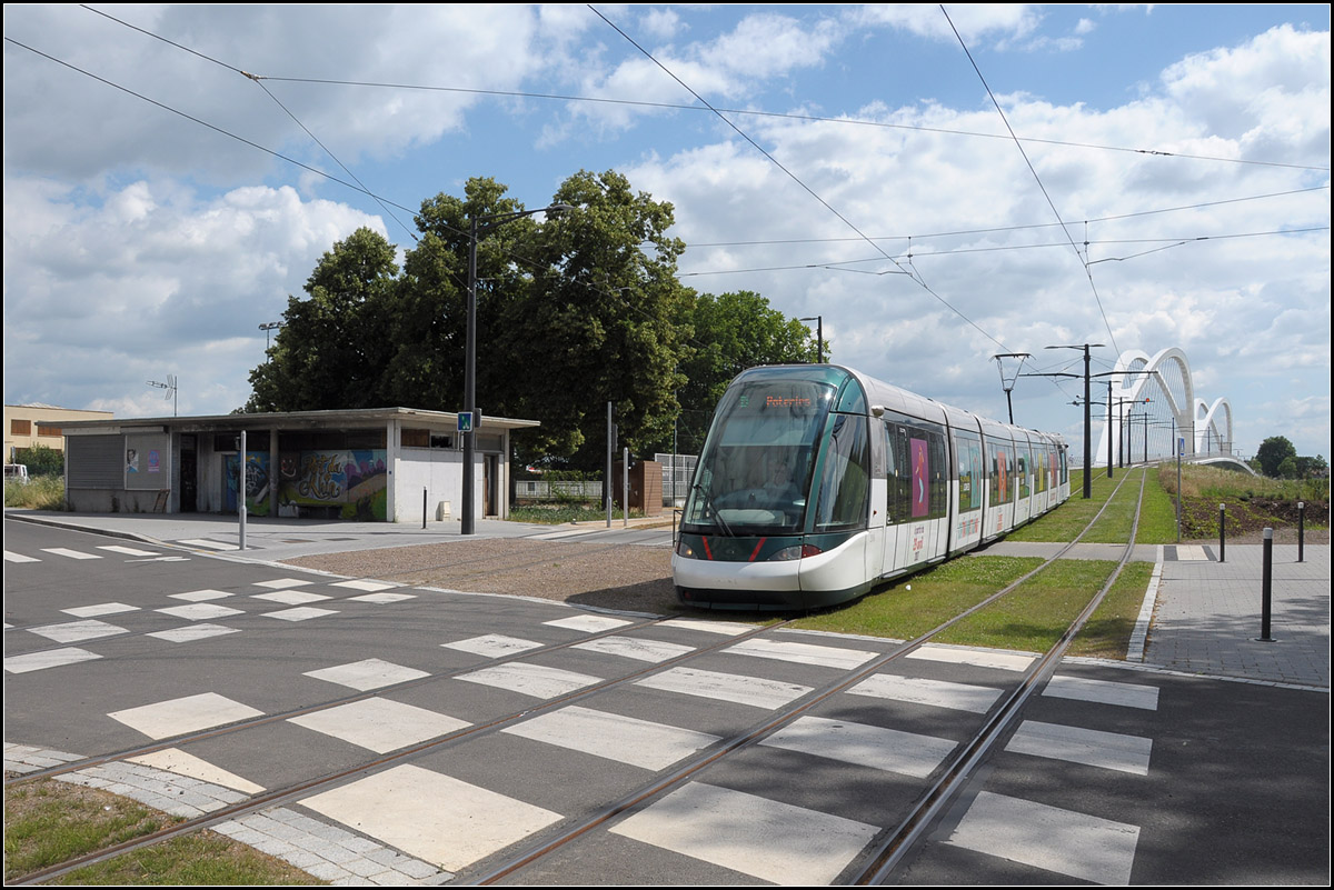 Eine Citadis-Tram erreicht nach Querung des Rheines das Stadtgebiet von Straßburg am Port du Rhin.
