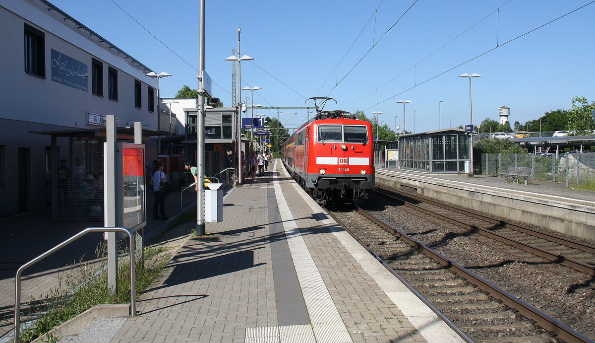 Bahnhof Langenargen an der Bodenseegürtelbahn, KBS 731, zwischen Friedrichshafen und Lindau, fotografiert am 27. Mai 2017. Blickrichtung Lindau. Im Jahre 2021 soll auf diesem Teilstück der Bodenseegürtelbahn der elektrische Zugbetrieb aufgenommen werden.