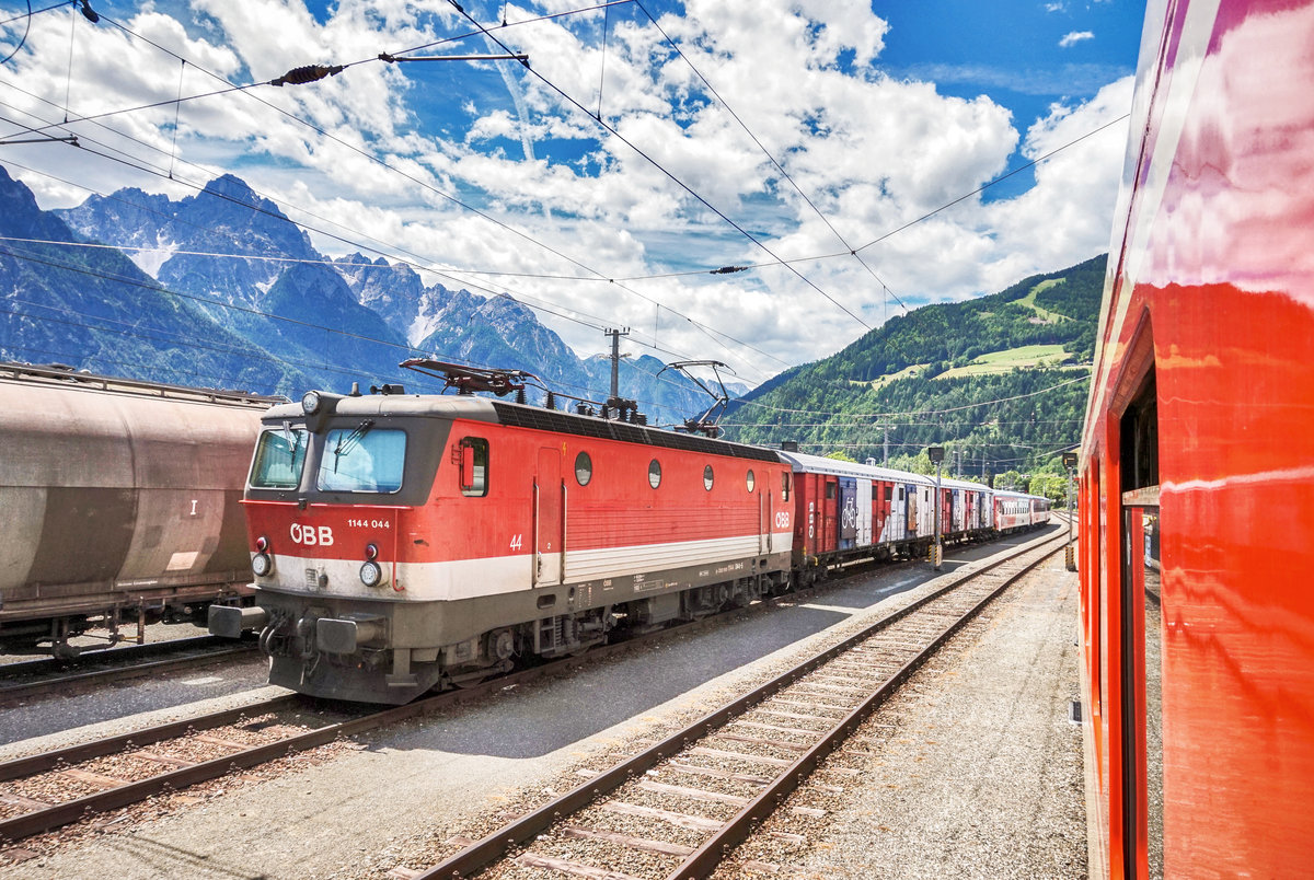 1144 044-5 steht mit einer Radlzug-Garnitur im Bahnhof Lienz.
