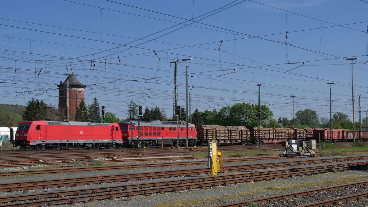 185 391 und 233 698 vor einem Holzzug in Richtung Bamberg; Lichtenfels, 11.05.2017