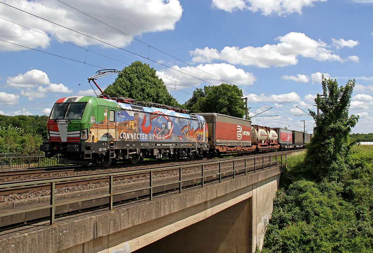 185 163-3 und 145 011-3 ziehen gemeinsam einen gemischten Güterzug in Richtung Würzburg,gesehen am 08.06.2017 bei Reilos.