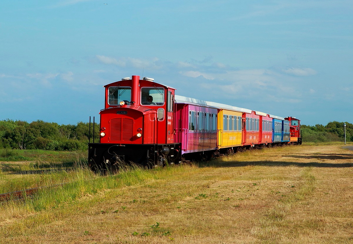 Am 04.06.2017 haben die Loks 5 und 1 der Langeooger Inselbahn mit ihrem Zug den Ortsbahnhof bald erreicht