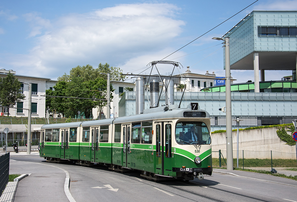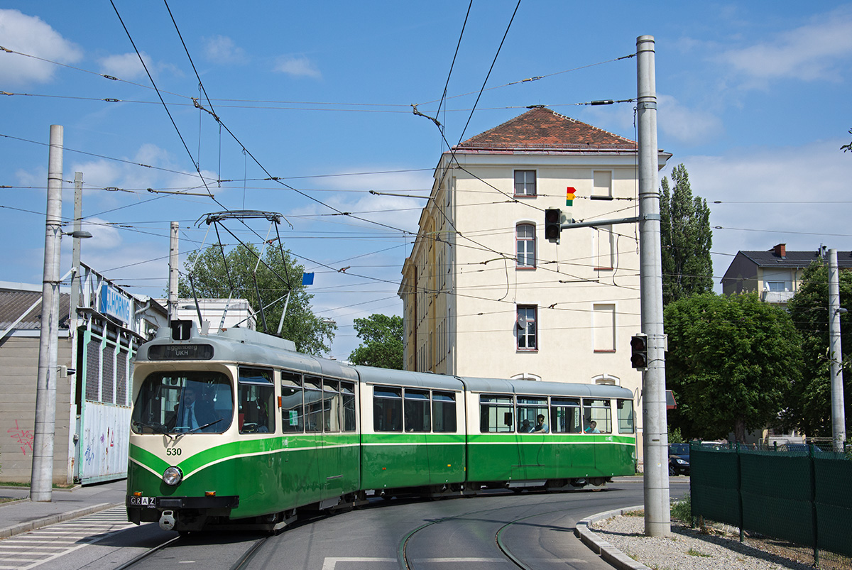 Am 21.05.2017 fand die Fotofahrt "letzte Fahrt" in Graz statt, hier ein wetieres Fotomotiv mit TW 530 als Linie 1 in der Kruezung Asperngasse/Laudongasse.