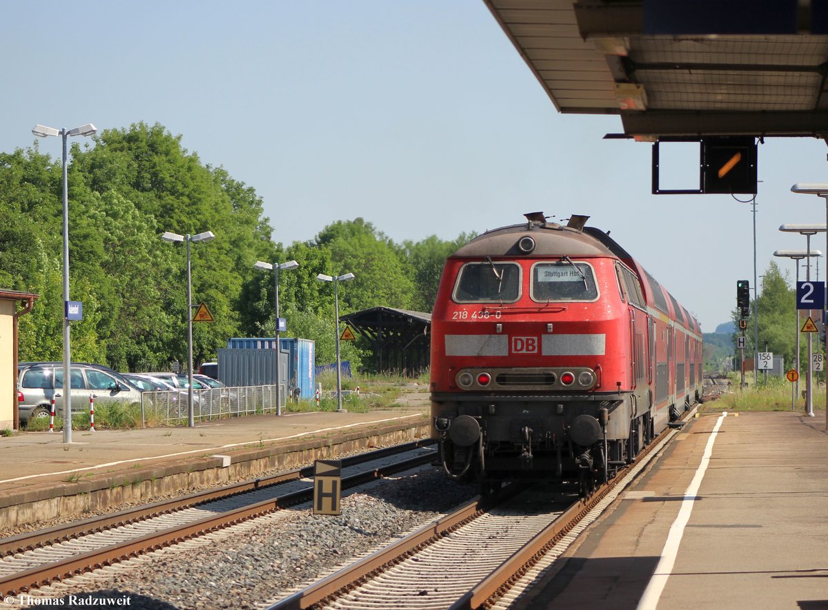 Aufnahme vom 29. Mai 2017. Der IRE nach Stuttgart über Ulm verläßt den Bahnhof Aulendorf an der Südbahn. Schublok ist 218 438-0. Ein solches Foto kann man voraussichtlich nur noch wenige Jahre machen, da die Südbahn, KBS 751, bis zum Jahr 2021 unter Fahrdraht sein soll. Gleichzeitig soll auch der Abschnitt von Friedrichshafen und Lindau der Bodenseegürtelbahn elektrifiziert sein.