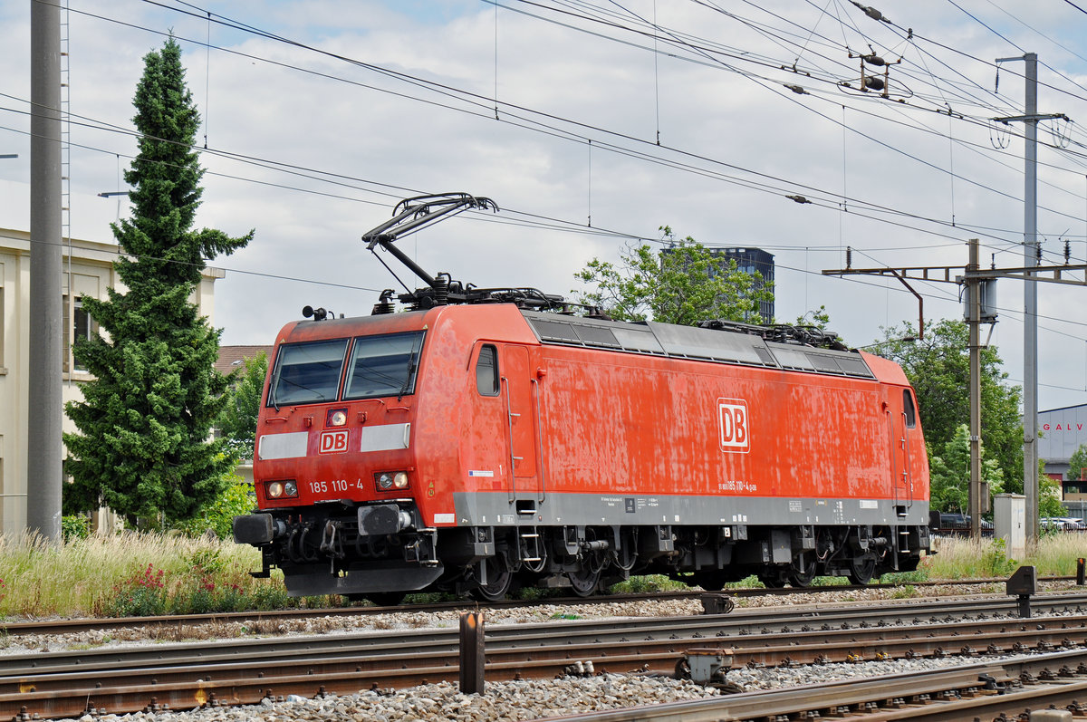 DB Lok 185 110-4 durchfährt den Bahnhof Pratteln. Die Aufnahme stammt vom 07.06.2017.