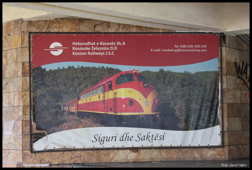 Ein großes Werbeplakat prangt hier am 21.5.2017 noch am Eingang zum Bahnhof Fuhse Kosove. Es zeigt eine NOHAB und macht Werbung für die Kosovo Railway. Leider entspricht die Wirklichkeit nicht mehr dem Aussehen der Lok auf dem Plakat!