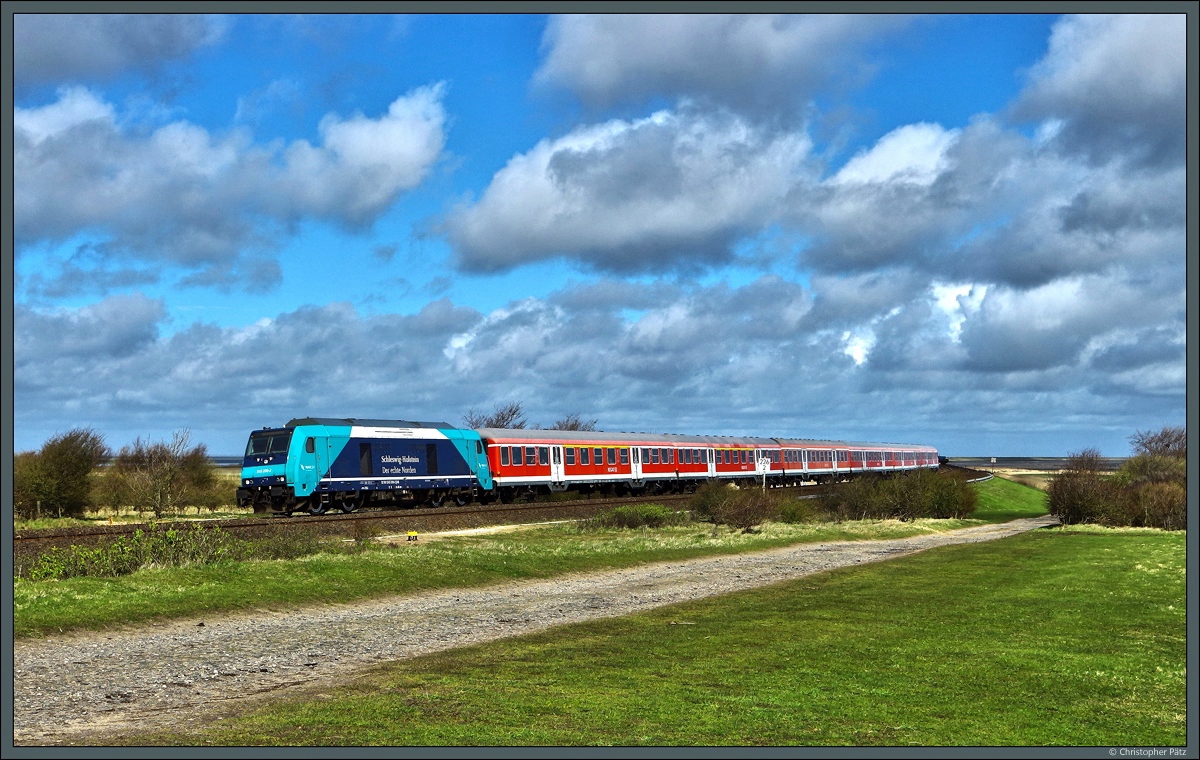 Mit einem Ersatzzug aus n-Wagen hat 245 209-2 am 15.04.2017 den Hindenburgdamm überquert und erreicht bei Morsum die Insel Sylt. Bis zum Zielbahnhof Westerland hat der RE 11016 nur noch wenige Minuten Fahrzeit vor sich.