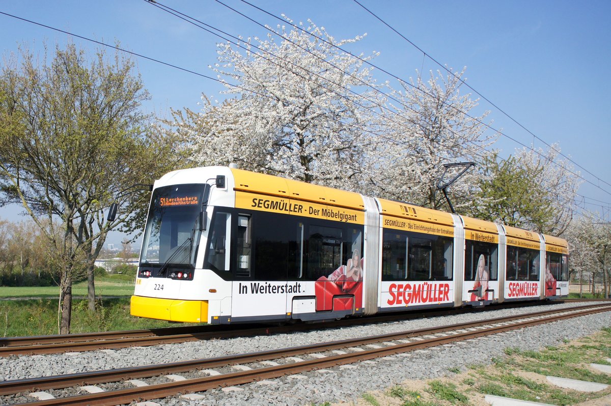 Straßenbahn Mainz / Mainzelbahn: Stadler Rail Variobahn der MVG Mainz - Wagen 224, aufgenommen im April 2017 zwischen Mainz-Lerchenberg und Mainz-Marienborn.