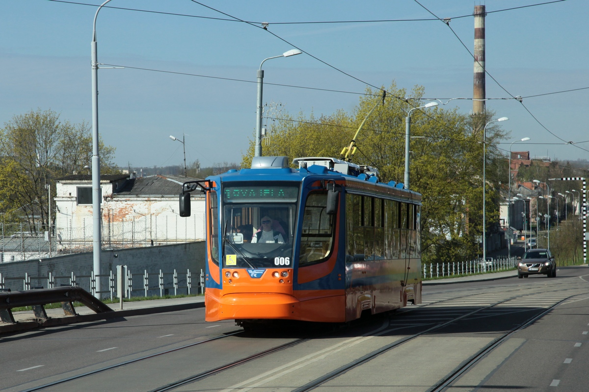Auf der Linie 1 in Daugavpils fährt der Neubau-Tw 005 in Richtung Stacija am 12.05.2017. Er kommt aus der Valskas iela und ist soeben auf die 18. novembra iela eingebogen.