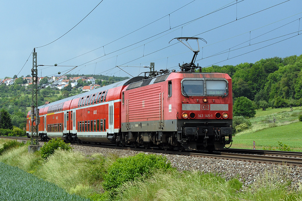 Foto der Südbahn in Blickrichtung Aulendorf, KBS 751, aufgenommen am 26. Mai 2017 am Bahnhof Weingarten-Berg. Solche Aufnahmen sind in wenigen Jahren nicht mehr möglich, da im Jahr 2021 die Südbahn elektrifiziert sein soll. Da auch der Abschnitt Friedrichshafen nach Lindau der Bodenseegürtelbahn unter Fahrdraht ist, fahren die Züge Ulm - Lindau unter elektrischer Traktion.