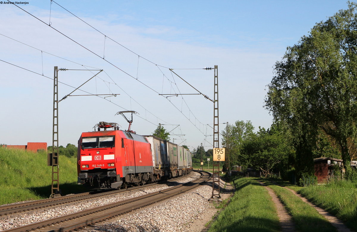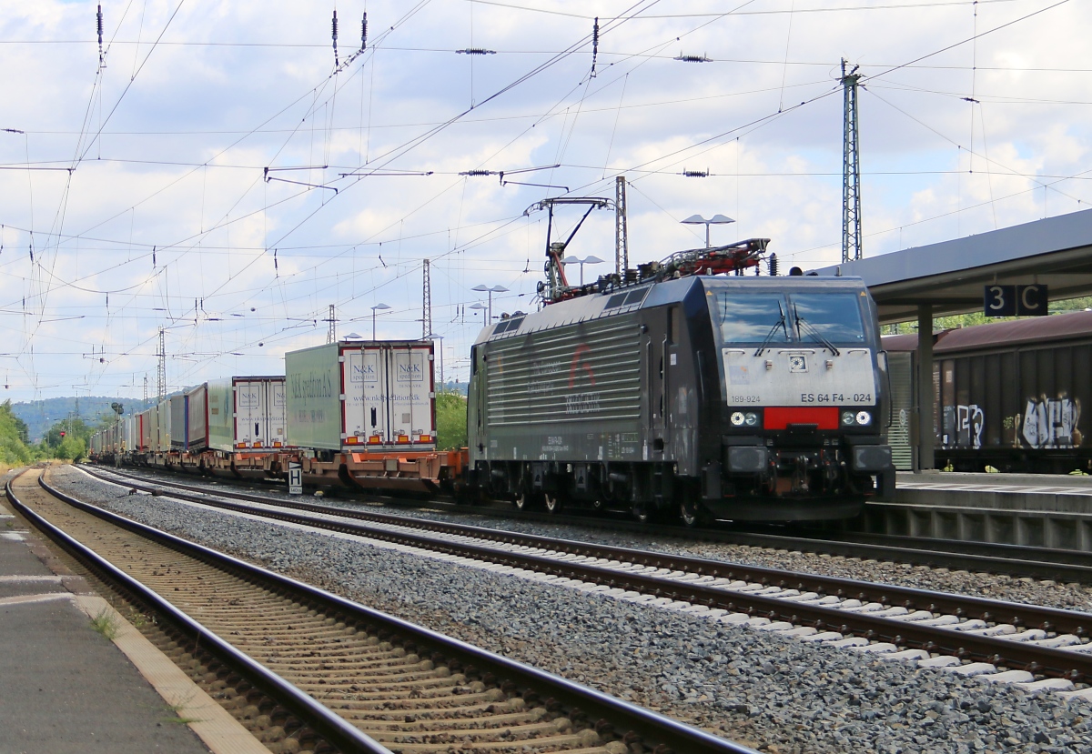 189 092 nähert sich mit einem Containerzug dem Abzweig Brunnenstück südlich von Karlsruhe bei Rüppur. Aufnahmedatum: 07.06.2017